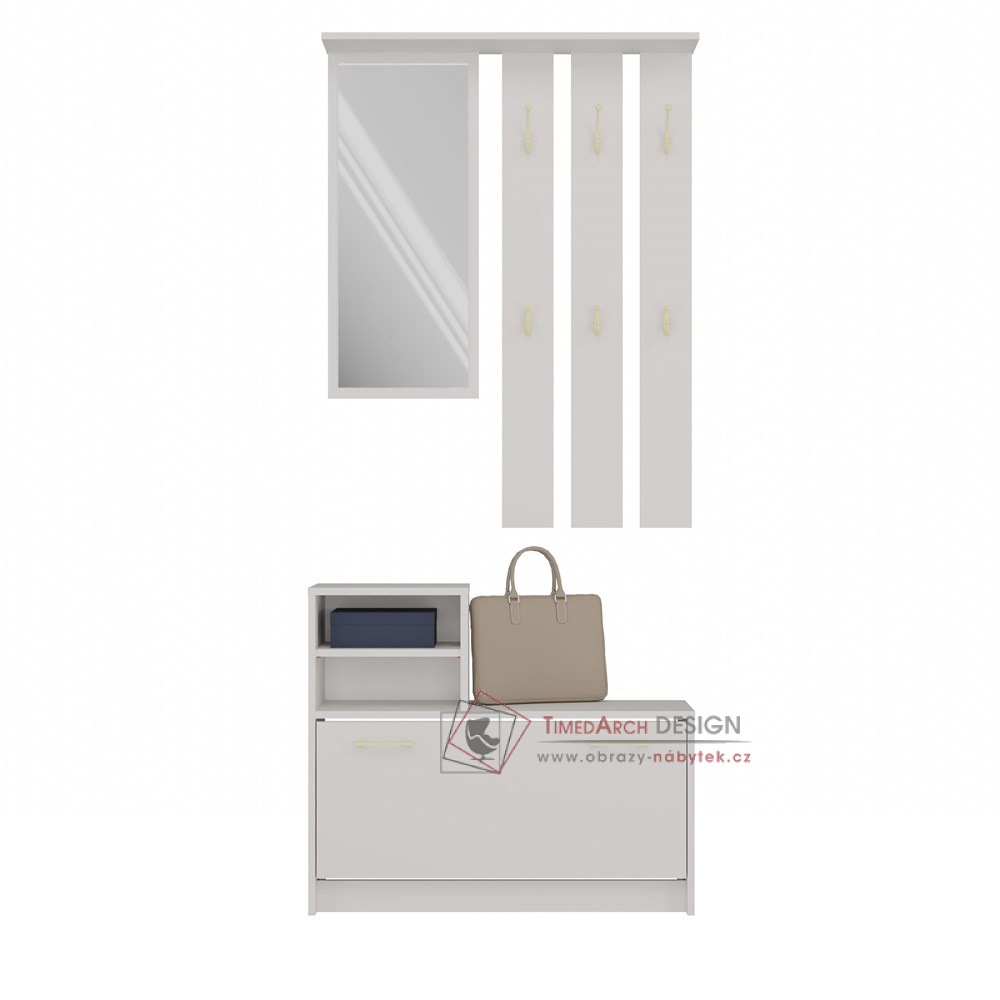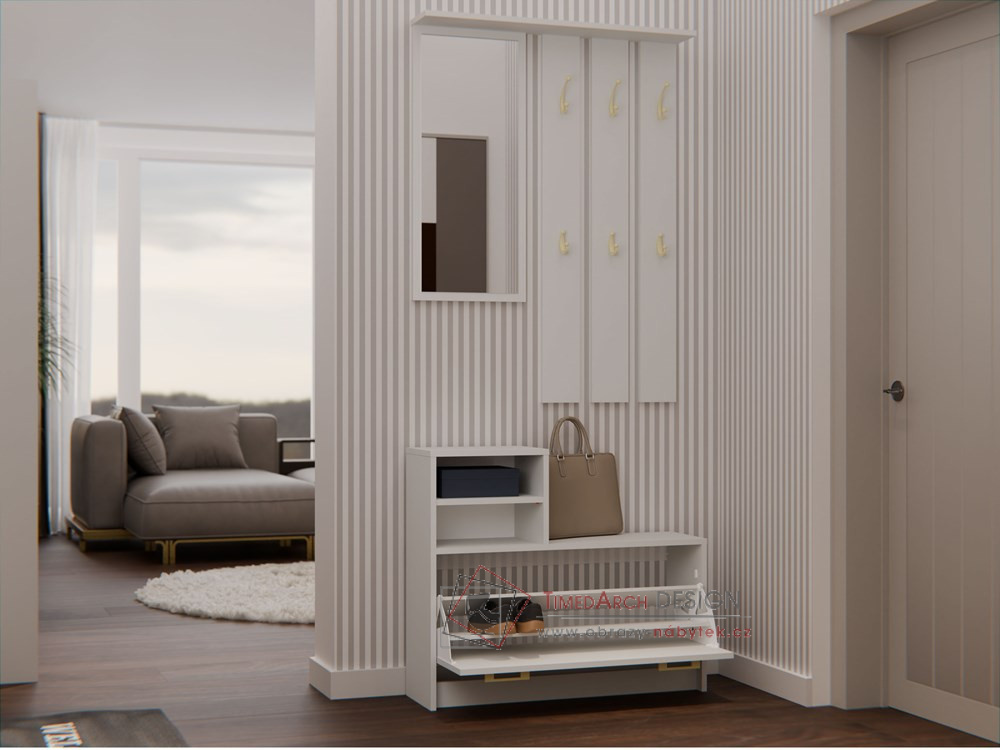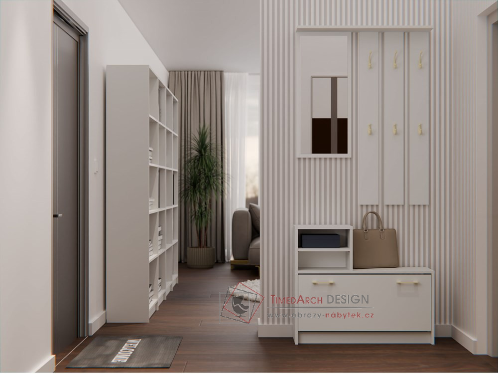 Je vybavená dostatečným množstvím háčků na oděv, zrcadlem, policemi i funkčním úložným prostorem na boty. Stěna je vyrobena ze snadno udržovatelného lamina, hrany jsou zakončené vysoce odolným ABS materiálem.