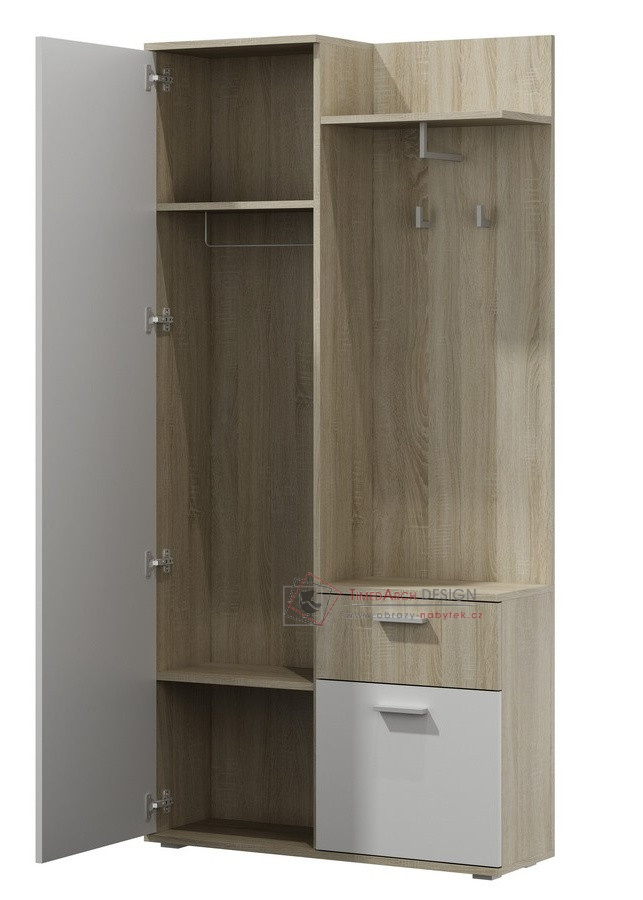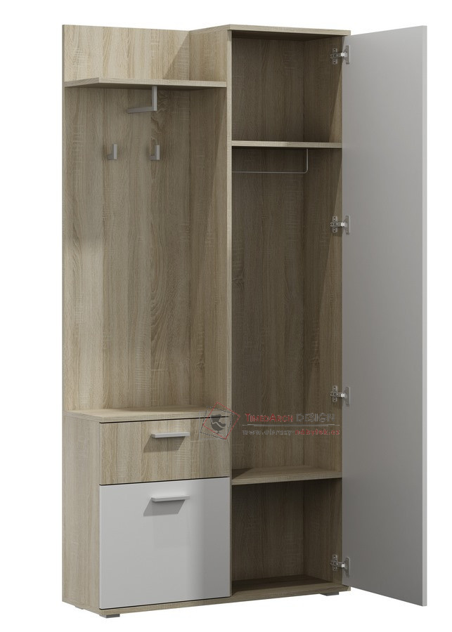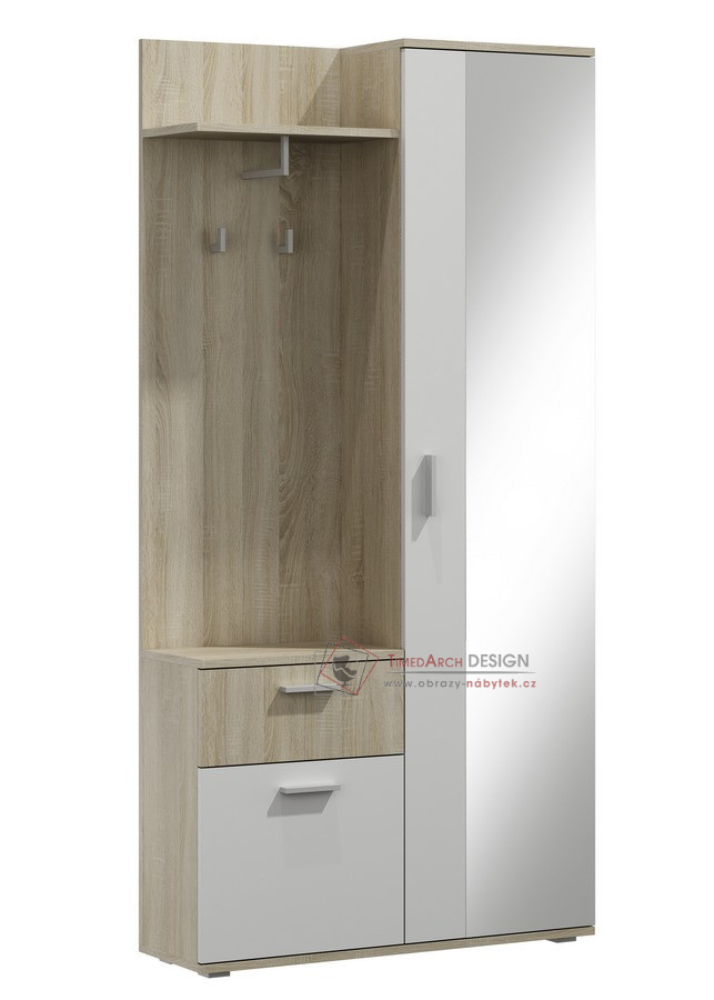 Sestava se skládá z věšákového panelu s policí, botníku se zásuvkou a šatní skříně se zrcadlem.