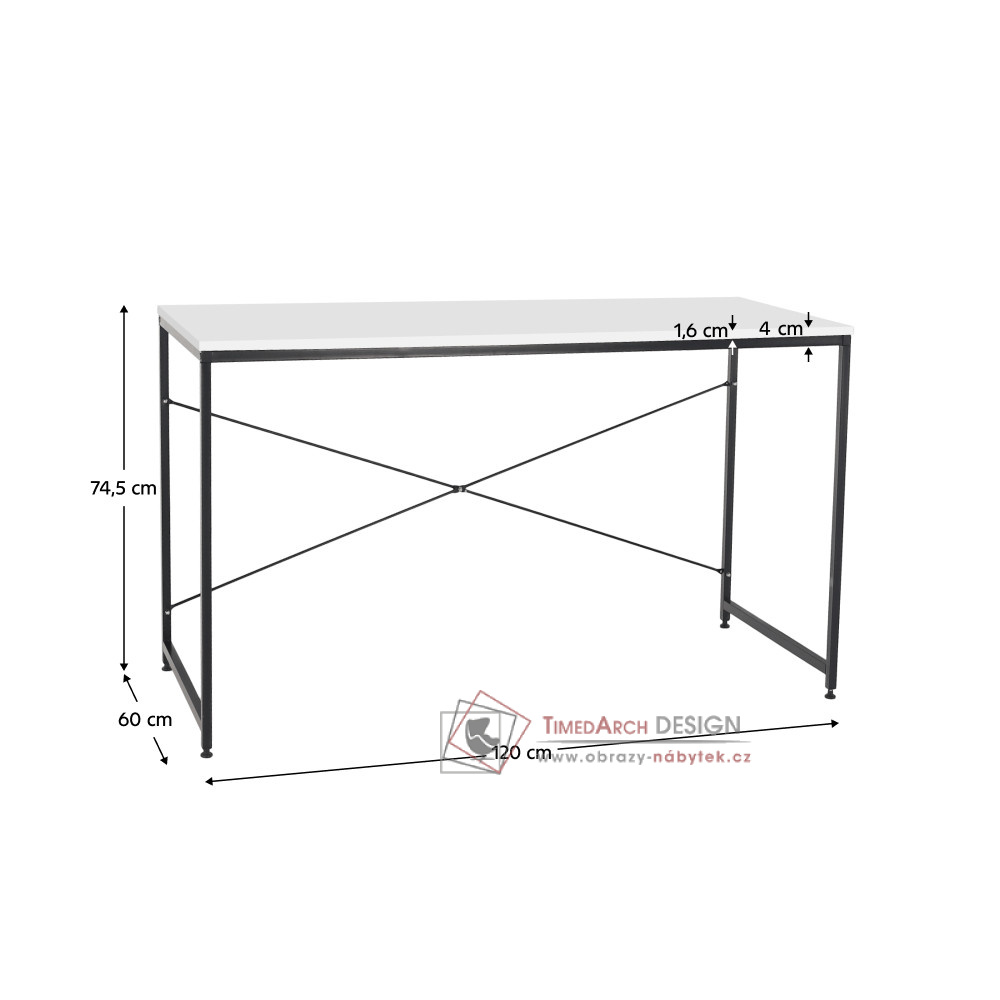 Konstrukci tvoří kov v černém provedení a stolní deska je z DTD laminované v bílém provedení. Na nohách se nacházejí rektifikační šrouby, kterými vyrovnáte stůl do roviny na jakékoliv podlaze. Prostorný, zajímavý, vhodný i do dětského či studentského pokoje.