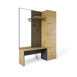 Kombinace moderních barev jako dub artisan v kombinaci s barvou antracit jí dodává jedinečný charakter. Designovým prvkem je zadní panel imitující trendové lamely. Za praktičnost sestavy jsou zodpovědné úložné prostory v podobě šatní skříně ve které se nacházejí 3 police. Snadný přístup ke kabátům zabezpečují věšáky, které jsou připevněny k zadnímu panelu panelu a také šatní tyč.