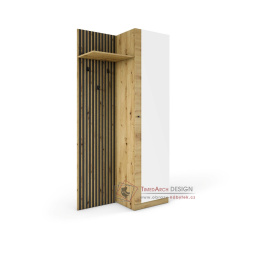 Kombinace moderních barev jako dub artisan v kombinaci s barvou antracit jí dodává jedinečný charakter. Designovým prvkem je zadní panel imitující trendové lamely. Za praktičnost sestavy jsou zodpovědné úložné prostory v podobě šatní skříně ve které se nacházejí 3 police. Snadný přístup ke kabátům zabezpečují věšáky, které jsou připevněny k zadnímu panelu.