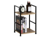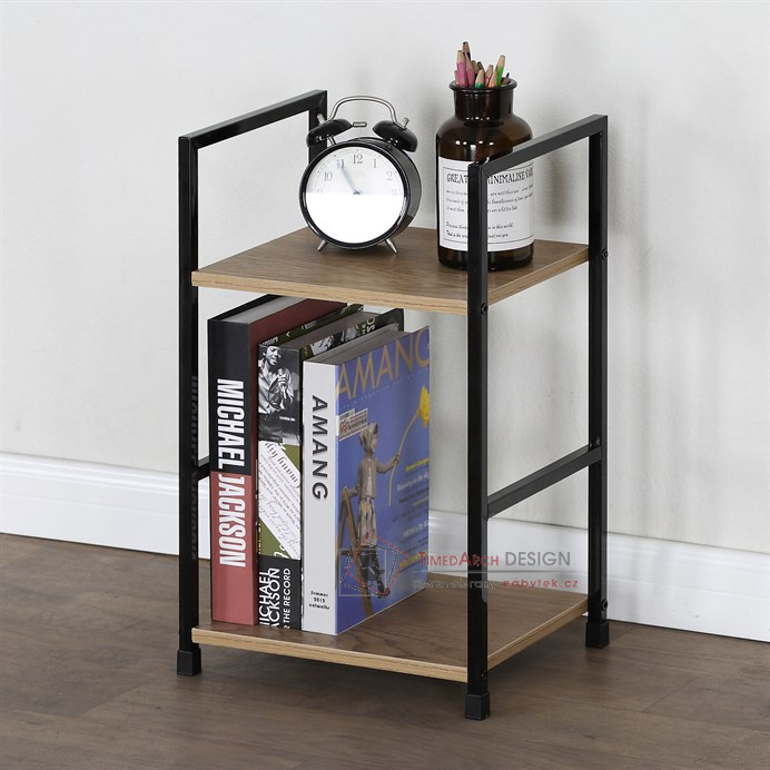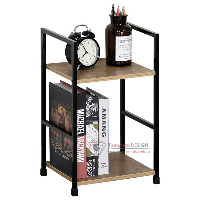 Kostra vyrobena z kovových hranatých profilů černé barvy. Na police je použita MDF deska s povrchovou úpravou 3D folie v textuře dubu. Balení obsahuje sadu umožňující připevnění ke stěně.
