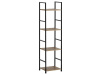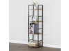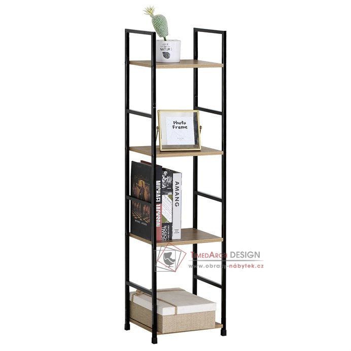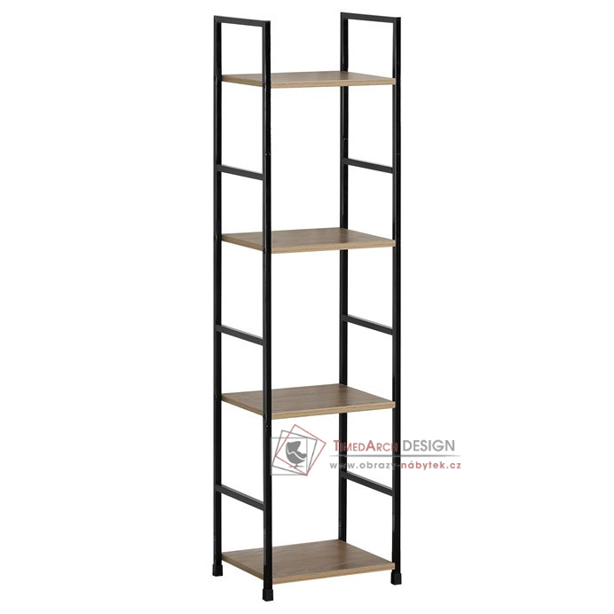 Kostra vyrobena z kovových hranatých profilů černé barvy. Na police je použita MDF deska s povrchovou úpravou 3D folie v textuře dubu. Balení obsahuje sadu umožňující připevnění ke stěně.