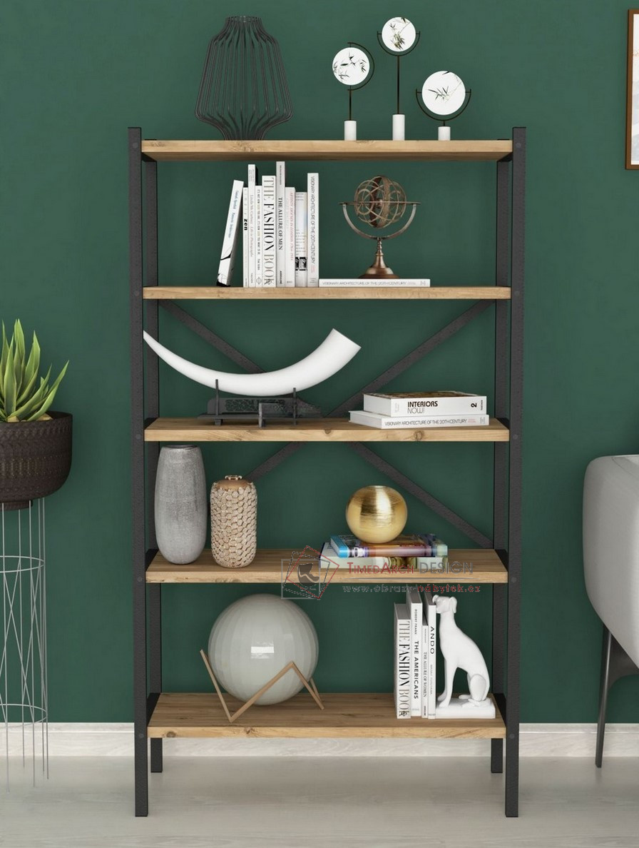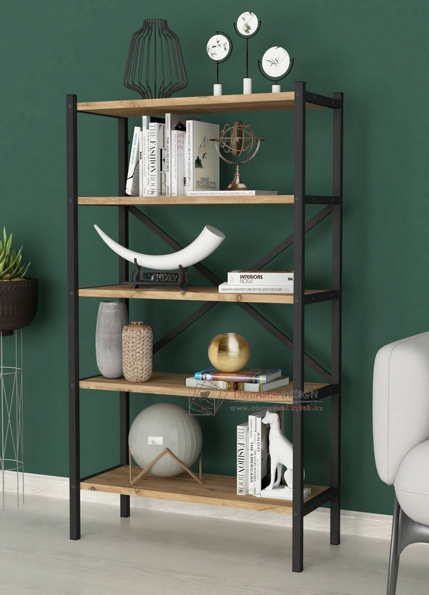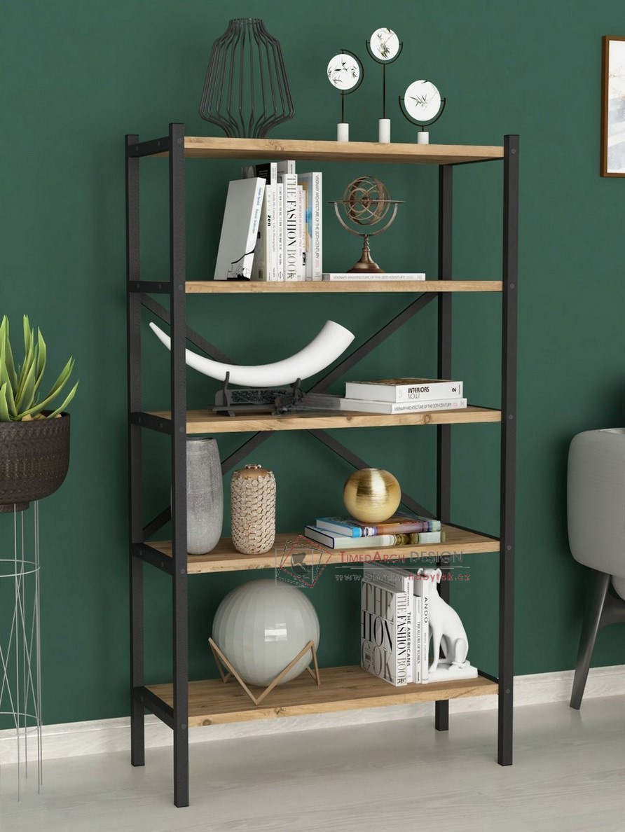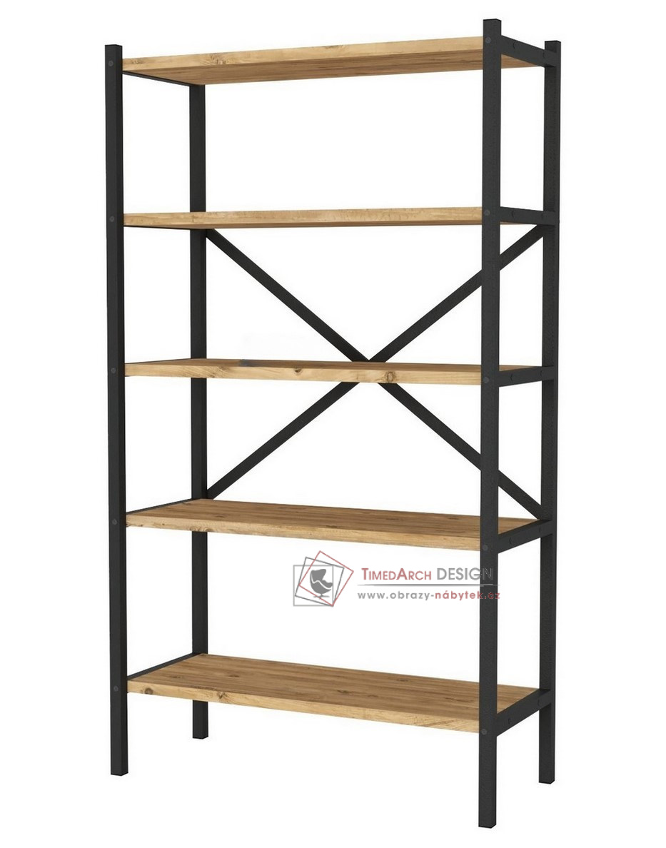 Konstrukce regálu je kovová černé barvy. Police jsou vyrobené z laminované DTD v barevném provedení borovice.