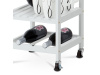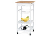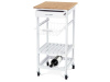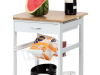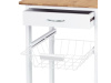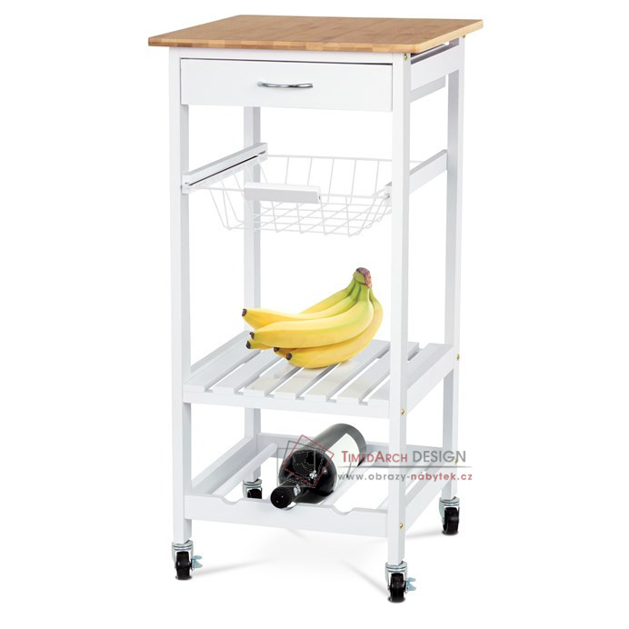 Konstrukce vozíku je z lakovaných MDF přířezů v bílé matné barvě. Kolečka jsou plastová, obě přední jsou opatřeny brzdičkami. Koš je svařený z kovových drátů a chromovaný. Velikost bambusové desky je 37 x 37 cm, což je příjemné zvětšení kuchyňské plochy a navíc mobilní.