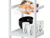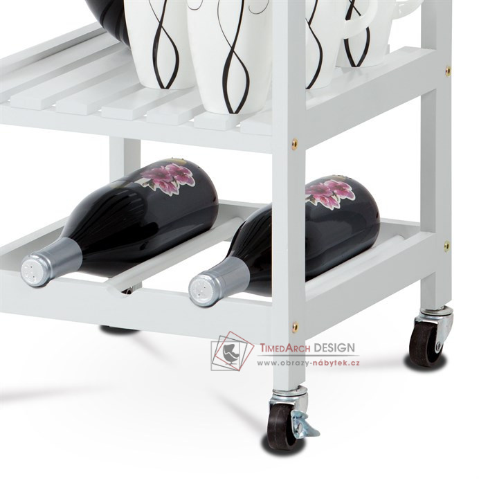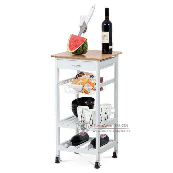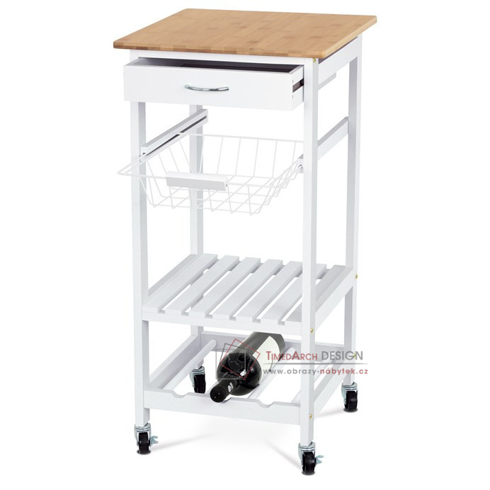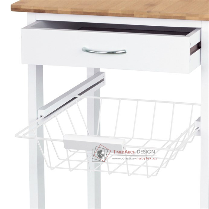 Plní funkci nejen při servírování, ale výborně slouží jako mobilní úložný prostor, a to nejen do kuchyně. Ve třech patrech nabízí variabilitu možností ukládání. Ve spodním patře je držák na tři lahve, nad ním je laťový rošt na možné uložení těžšího nádobí a jako poslední tvoří výsuvný drátěný koš s praktickou dřevěnou úchytkou. Ten nabízí nepřeberné možnosti ukládání od ovoce až po nádobí či jiné kuchyňské potřeby. Deska je zhotovena z masivního bambusu v přírodním odstínu, opatřena silnou deskou odolného transparentního laku. Tím je zaručena eliminace poškození desky rozlitou tekutinou. Navíc bambus jako takový odpuzuje vodu. Krytý úložný prostor tvoří jedna menší zásuvka s chromovaným madlem. Zde je možné uložit příbory či drobné kuchyňské předměty, popř. jako skryté místo na sladkosti.