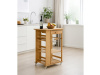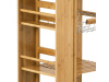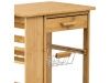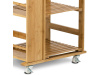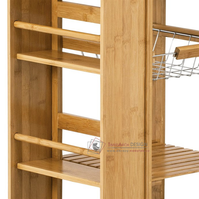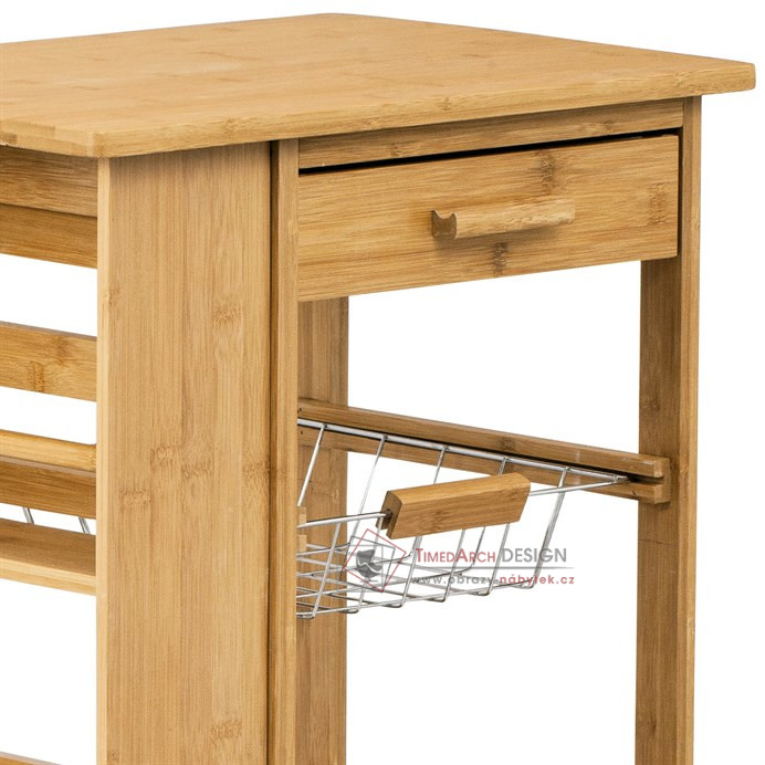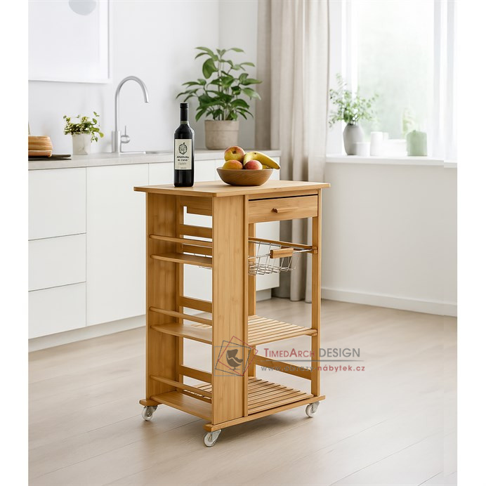 Plní funkci nejen při servírování, ale výborně slouží jako mobilní úložný prostor, a to nejen do kuchyně. Ve třech patrech nabízí variabilitu možností ukládání. Spodní a první patro tvoří pevné roštové poličky na možné uložení těžšího nádobí a nad nimi je výsuvný drátěný koš s praktickou dřevěnou úchytkou. Ten nabízí nepřeberné možnosti ukládání od ovoce až po nádobí či jiné kuchyňské potřeby. Deska i konstrukce je zhotovena z masivního štípaného bambusu v přírodním odstínu, opatřena silnou deskou odolného transparentního laku. Tím je zaručena eliminace poškození desky rozlitou tekutinou. Navíc bambus jako takový odpuzuje vodu. Krytý úložný prostor tvoří jedna menší zásuvka s dřevěným madlem. Zde je možné uložit příbory či drobné kuchyňské předměty, popř. jako skryté místo na sladkosti. Z jednoho boku má stolek 3 poličky na umístění lahví se zábranami proti vypadnutí a rozlití.