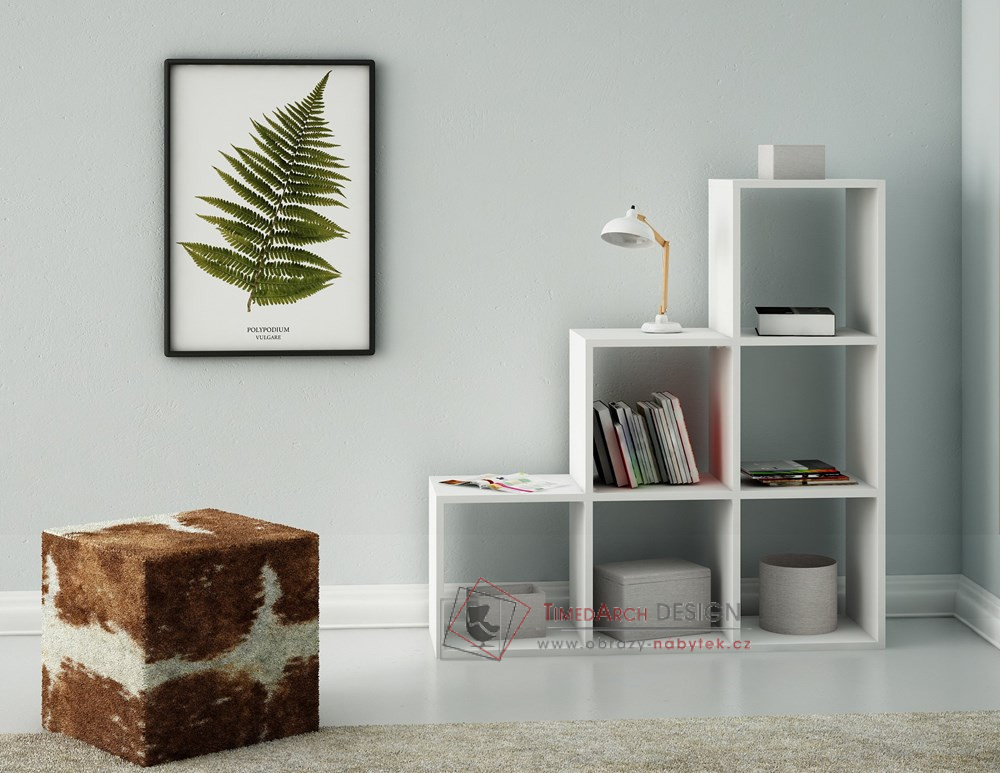 Jeho asymetrický tvar je ideální pro moderní prostory, kde se počítá originalita a originální řešení. Regál může plnit mnoho funkcí – od typické knihovny, přes místo pro uložení dekorací, až po prvek rozdělení prostoru v místnosti. Nábytek je vyrobený z laminované desky, hrany jsou povrchově upraveny ABS plastem - vyznačuje se vysokou mechanickou a chemickou odolností.