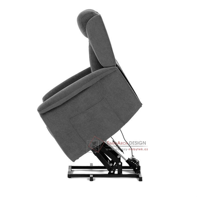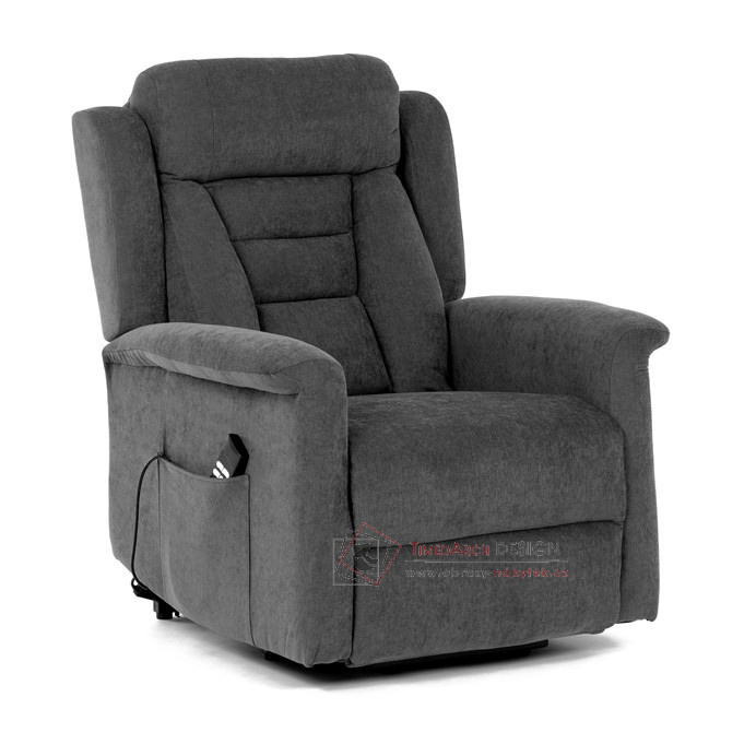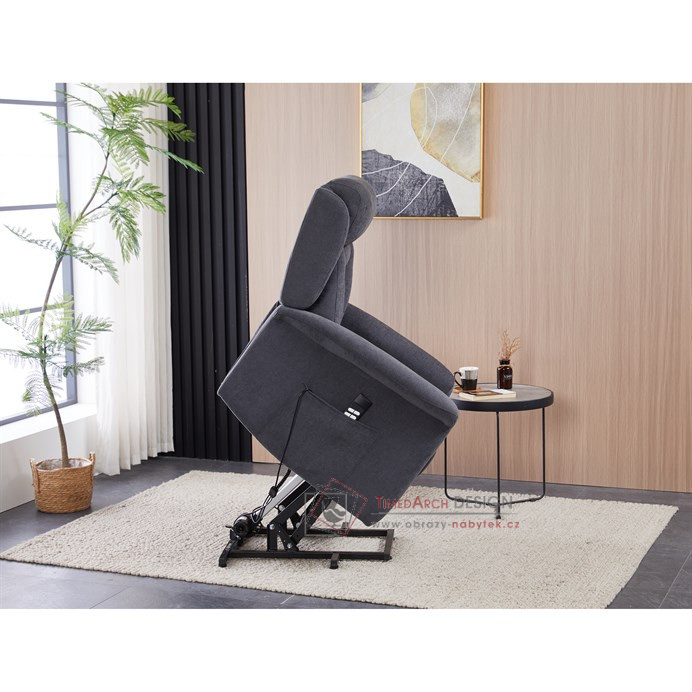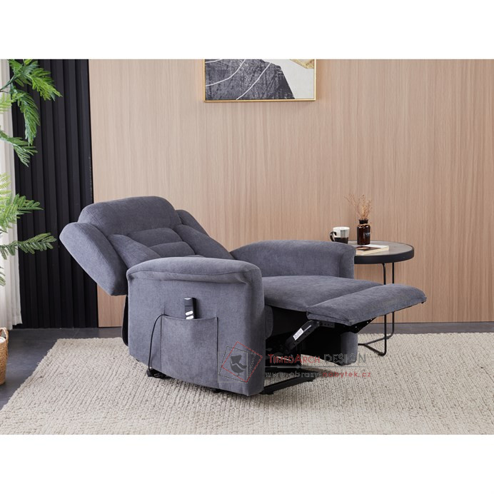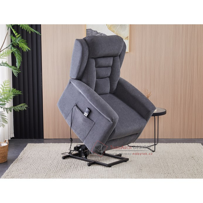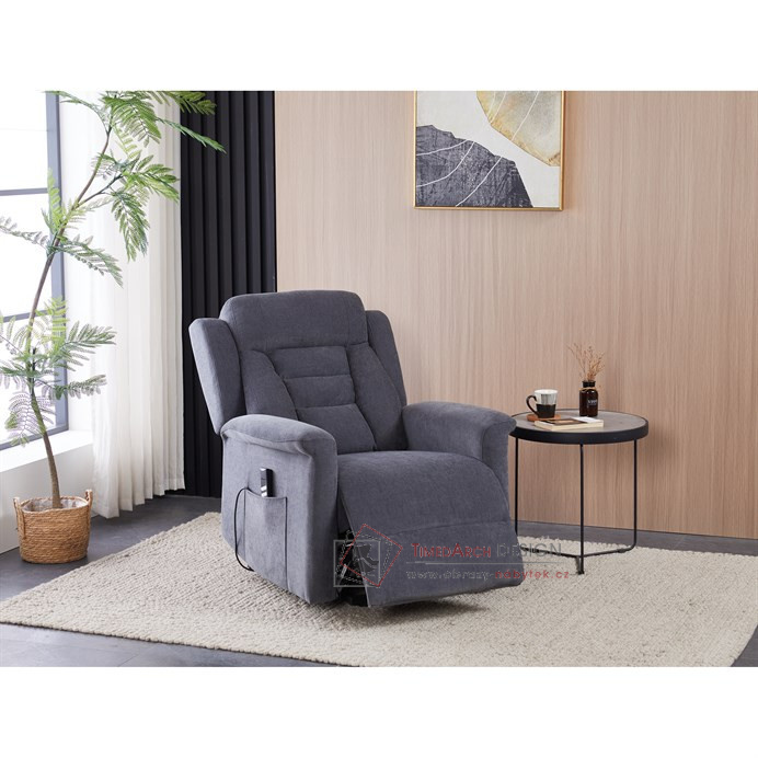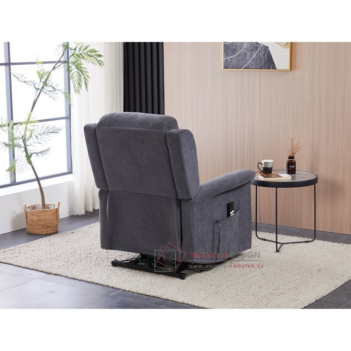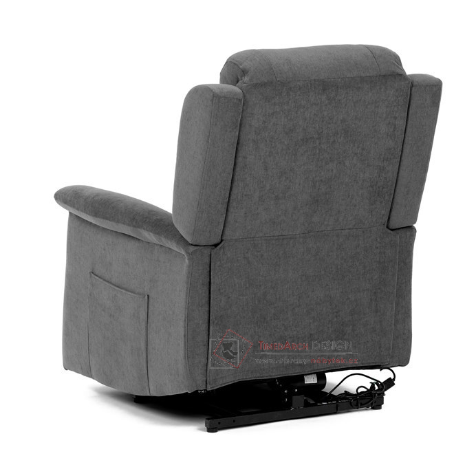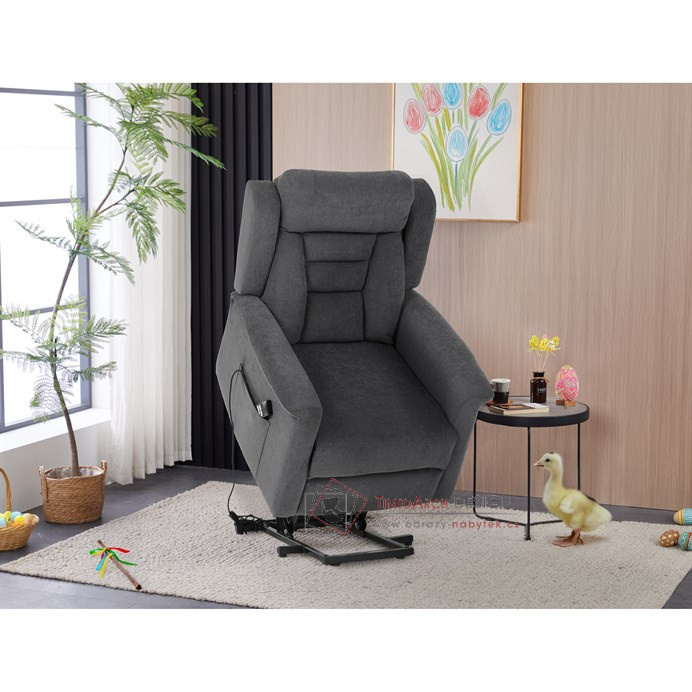 Jeho moderní šedé čalounění z hladké látky zajišťuje příjemný dotek a snadnou údržbu. Díky elektrickému ovládání a dvěma motorům lze křeslo snadno polohovat. Speciální výklopná funkce usnadňuje vstávání. Polstrované područky a ergonomický tvar poskytují dokonalou oporu při odpočinku. Tento stylový a praktický kus nábytku perfektně doplní každý interiér a přinese do vašeho domova kousek luxusu i pohodlí.