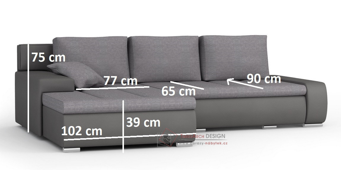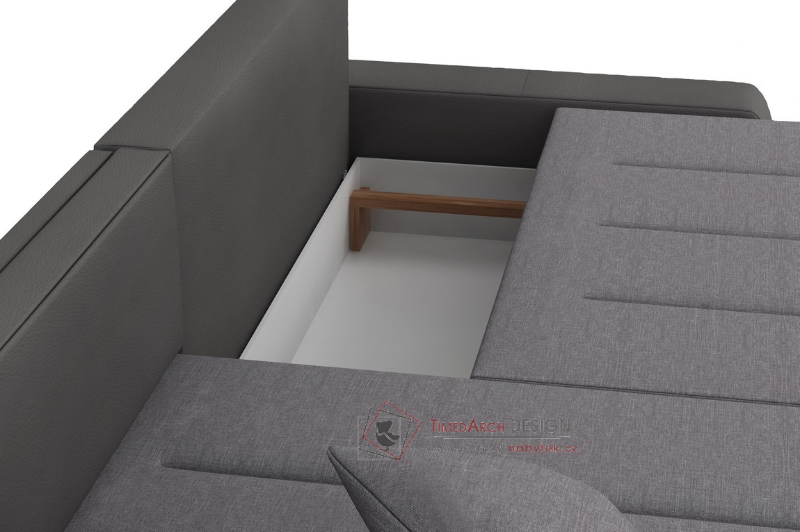 Rohová rozkládací sedačka s úložným prostorem TARO je očalouněna v kombinaci látek dle výběru z nabídky.