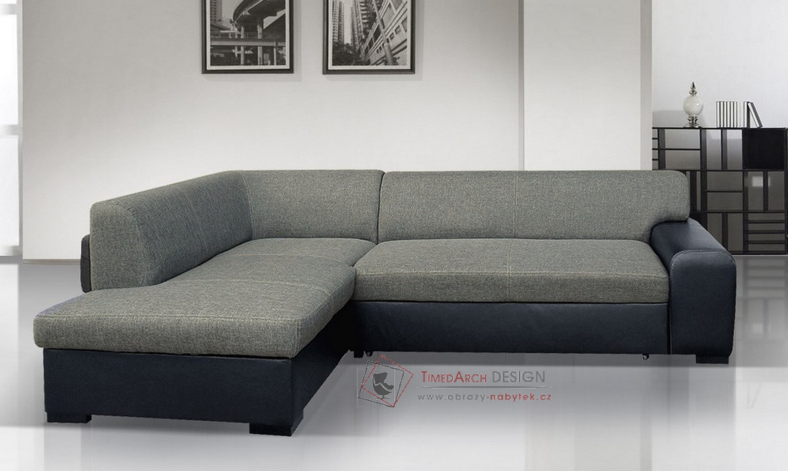 Rozkládací rohová sedačka s úložným prostorem MINOS je v akčním provedení očalouněná v kombinaci černé ekokůže Madryt 1100 a látky šedé barvy Sawana 21.