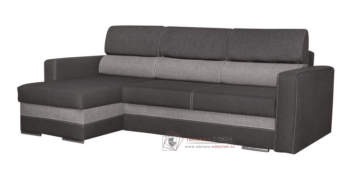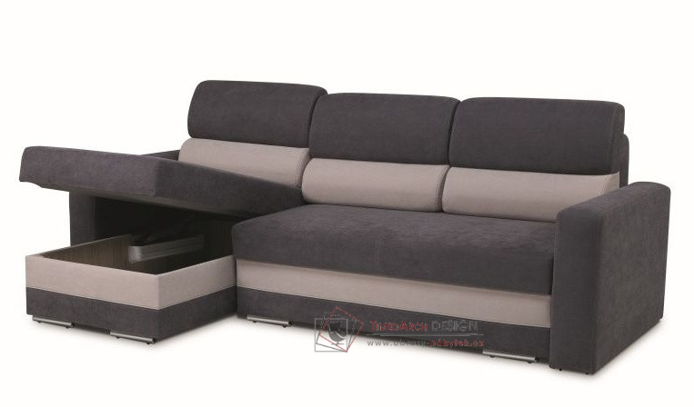Celočalouněná, rozkládací rohová sedačka s úložným prostorem RIMINI je očalouněna v kombinaci látek dle výběru z nabídky.