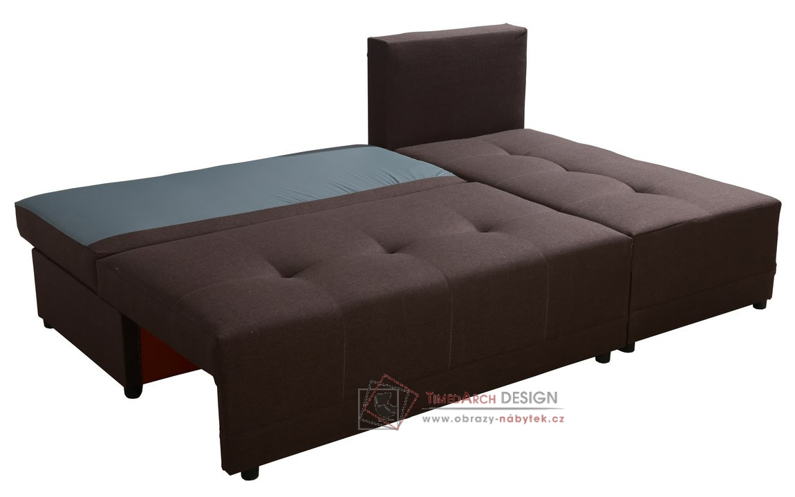 Rozkládací rohová sedačka s úložným prostorem MAX je očalouněna v akčním provedení kombinaci látek Inari 28 a Inari 22.