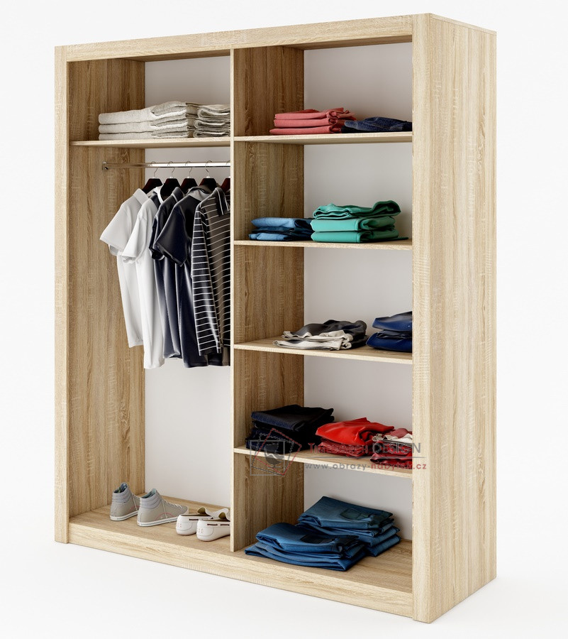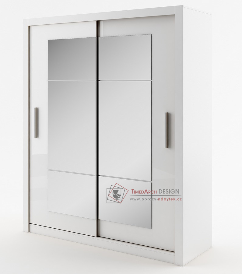 Hrany u skříně jsou olepeny ABS páskou, hliníkové pojezdy. Dveře jsou osazeny zrcadlem. Uspořádání polic viz. obrázek.