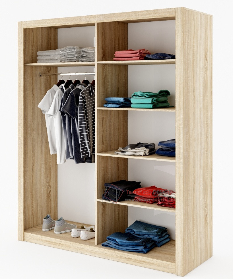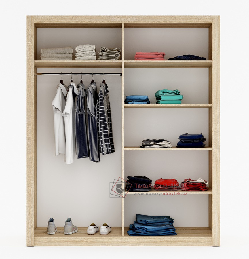 Hrany u skříně jsou olepeny ABS páskou, hliníkové pojezdy. Dveře jsou osazeny zrcadlem. Uspořádání polic viz. obrázek.