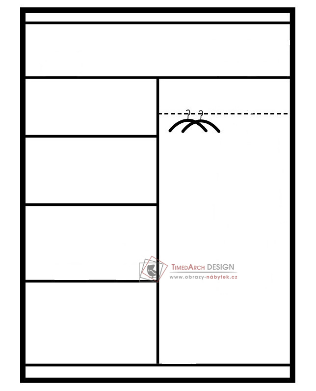 Dveře jsou osazeny zrcadly. Uspořádání polic viz. perokresba. Hrany u skříně jsou olepeny ABS páskou.