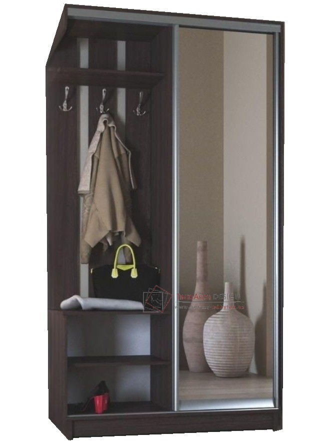 Tato šatní skříň Vám nabízí nejen skrytý úložný prostor, ale také otevřenou věšákovou stěnu, což oceníte nejen ve své ložnici, ale také v předsíní, vstupní hale, chodbě či kanceláři. Nezvyklá výška 220 cm nabídne opravdu dostatek prostoru. Korpus i dveře jsou z kvalitní LTD desky v barvě wenge. Skříň má aluminiové kování a lišty, dveře jsou osazeny zrcadlem. Další výhodou je univerzálnost skříně, kdy se dá složit s věšáky jak na pravé tak na levé straně.