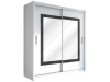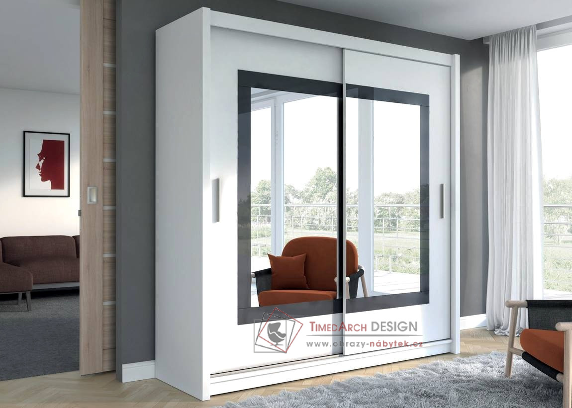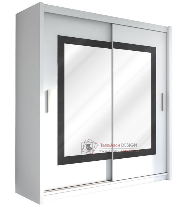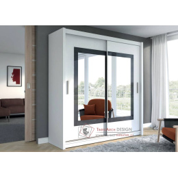 Dveře jsou osazené zrcadlem a lemované šedým sklem. Uspořádání polic viz. perokresba. Hrany u skříně jsou olepeny ABS páskou. Hliníkové pojezdy.