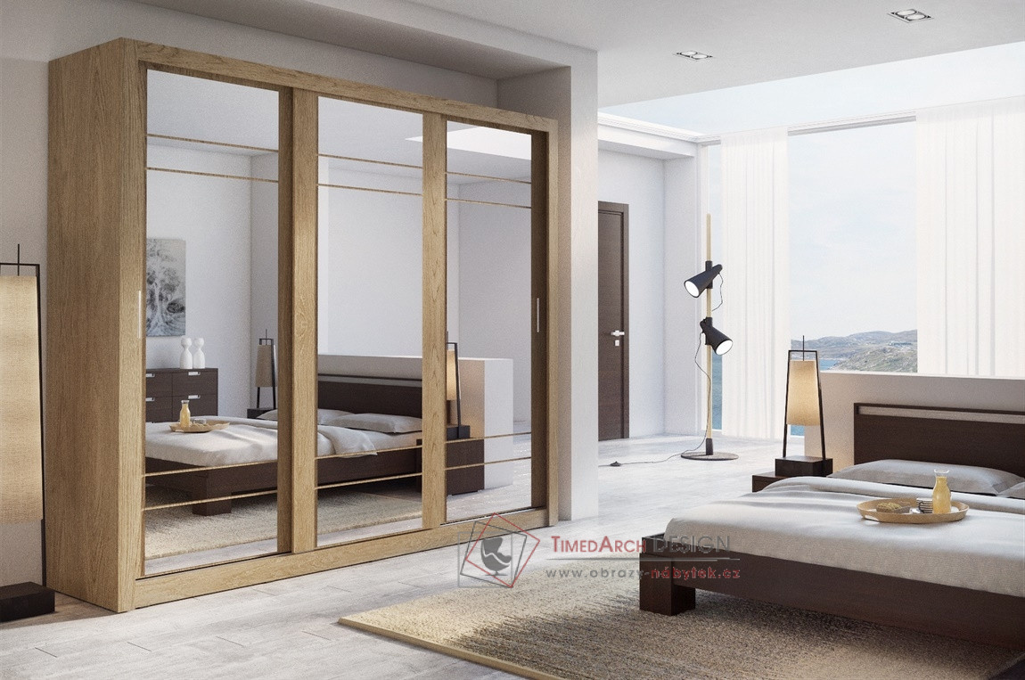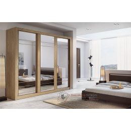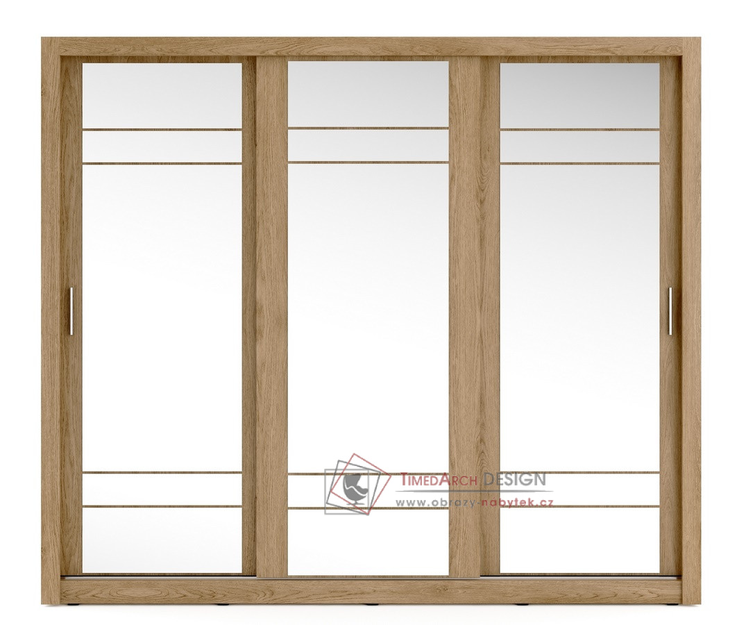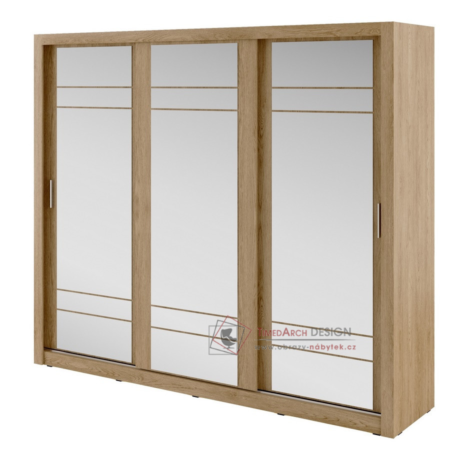 Šatní skříň třídveřová s posuvnými dveřmi ARTI je vyrobená z laminované DTD v barevném provedení dub shetland.