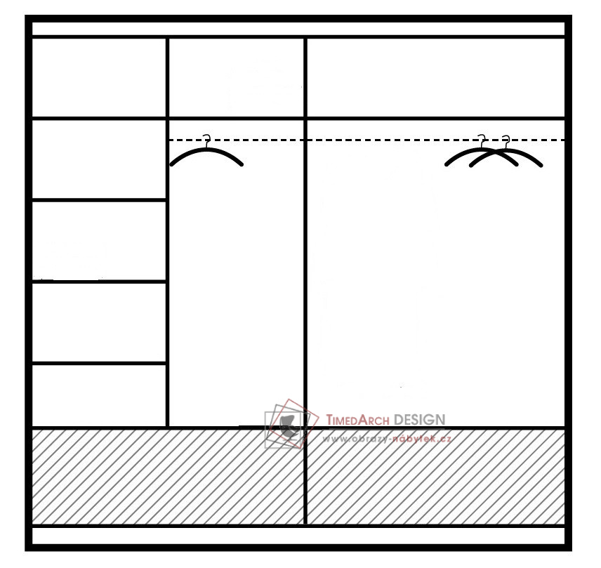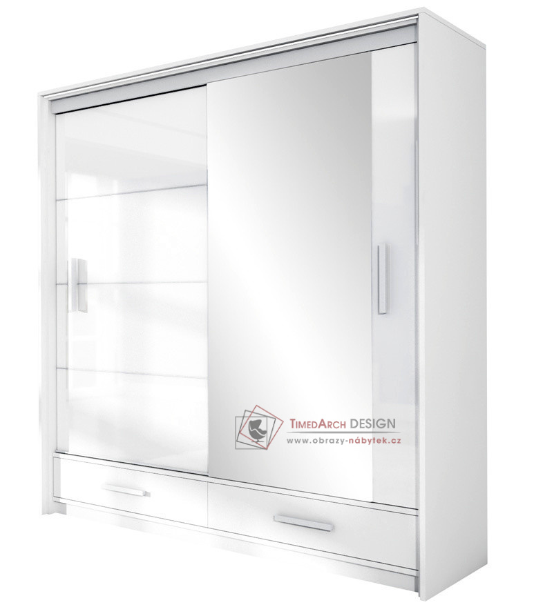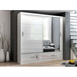 Dveře v barevném provedení bílý lesk + zrcadlo. Uspořádání polic viz. perokresba. V dolní části skříně se nacházejí 2 velké zásuvky. Hrany u skříně jsou olepeny ABS páskou. Kvalitní kování Sevroll. Dodáváno včetně LED osvětlení.