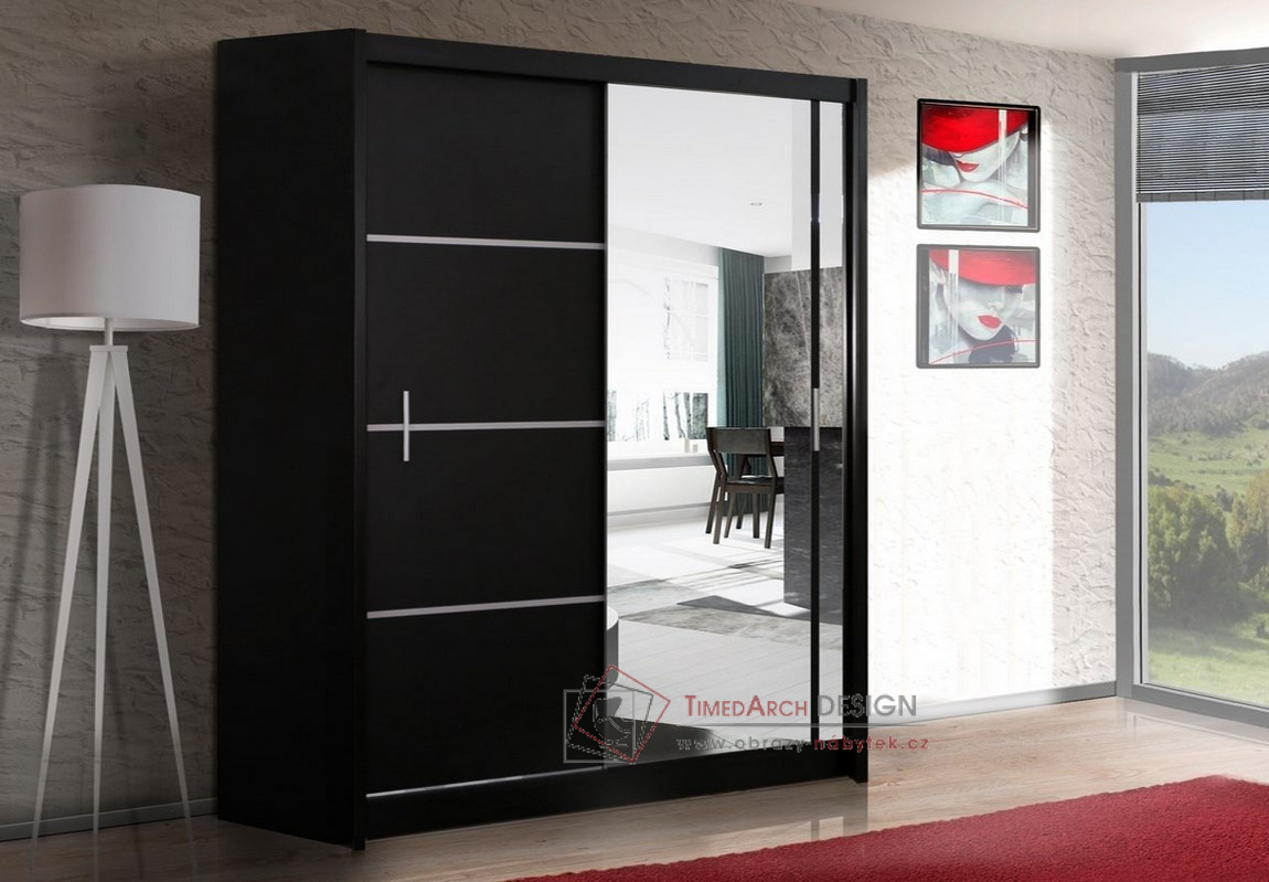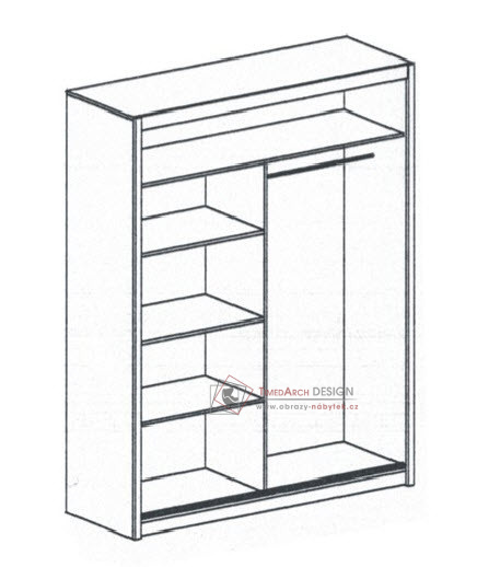 Šatní skříň s posuvnými dveřmi VISTA je vyrobená z laminované DTD v barvě černý mat. Dveře jsou osazeny zrcadlem. Uspořádání polic viz. perokresba.