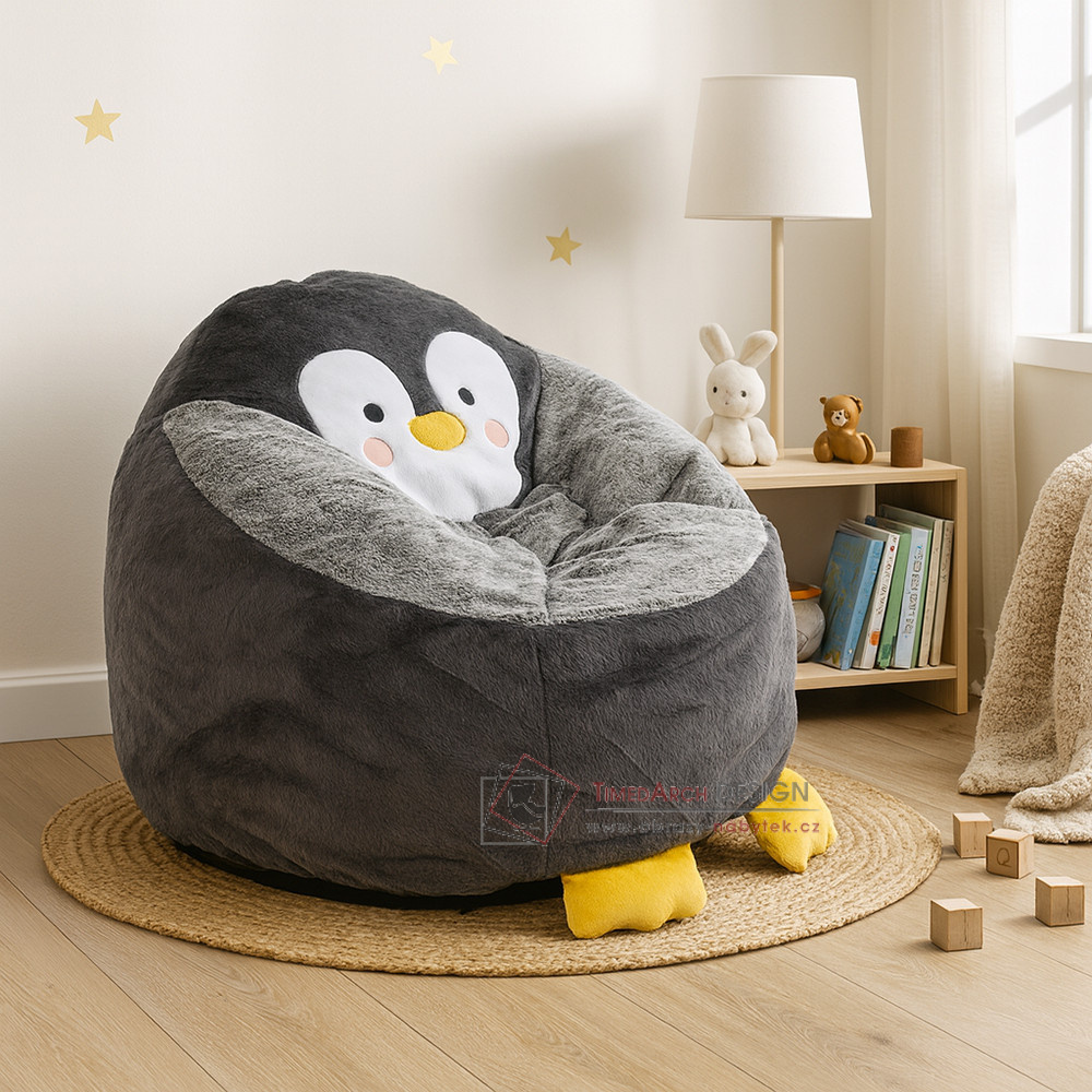 Tento veselý pytel ve tvaru tučňáka má výrazné detaily, jako jsou růžová líčka, žlutý zobáček a malé žluté nožičky, které dodávají tučňákovi přátelský vzhled. Jeho povrch je z příjemného plyšového materiálu, který je měkký na dotek a vyniká snadnou údržbou. Vak je vyroben z tmavě šedé látky v kombinaci s šedou a vypleněný je kompresní pěnou. Jedná se o stlačenou pěnu, proto doporučujeme otevřít pěnu a nechat ji dosáhnout svého objemu 24 hodin, aby byl tvar co nejlepší. Jeho veselý design zároveň povzbudí dětskou představivost a kreativitu. PINGO se snadno stane oblíbeným místem k odpočinku pro vaše dítě, a zároveň krásnou ozdobou interiéru.