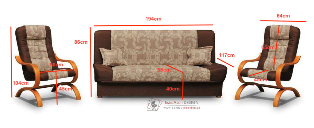 Křesla mají lehkou konstrukci z ohýbaného dřeva, díky tomu nezaberou moc místa a lehce se s nimi manipuluje. Třísed je rozkládací. Jednoduchým rozložením pomocí systému "klik klak" získáte lůžko k občasnému přespání Vaší návštěvy. Záda pohovky jsou očalouněna krycí čalounickou látkou z důvodu systému rozkladu tzv. klik-klak. Součástí je i úložný prostor na lůžkoviny. Křesla jsou dodávána v demontu. Vyobrazené dopňky a dekorace nejsou v ceně.