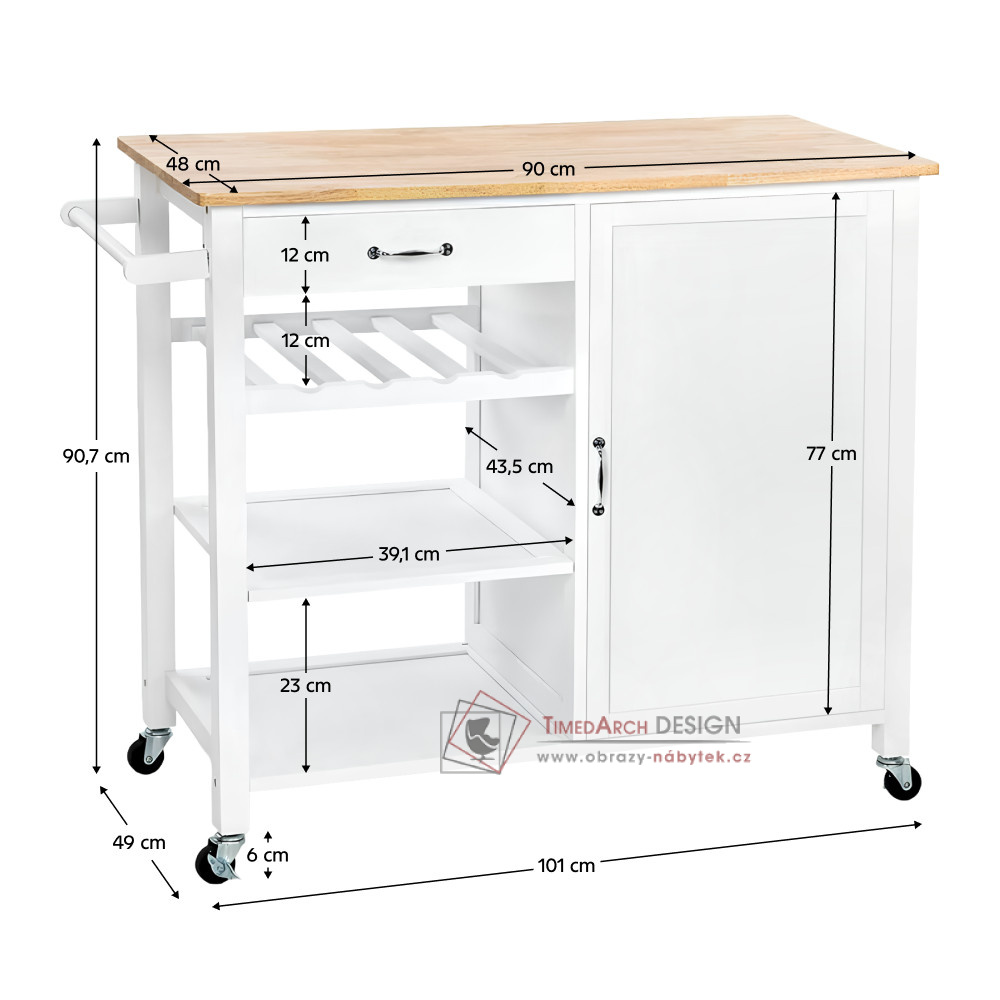 Vyniká moderním designem, který kombinuje bílou barvu s přírodním dřevěným dekorem , čímž přináší do prostoru svěžest a eleganci. Vyroben je z kvalitní MDF doplněné o pevnou dřevěnou dýhu, což zaručuje jeho odolnost a dlouhou životnost. Díky kolečkům je snadno přesouvatelný a flexibilní, což z něj činí ideální řešení pro každodenní používání i speciální příležitosti. Nabízí množství úložného prostoru , který pomáhá udržovat pořádek a zároveň slouží jako praktická plocha pro servírování jídel či nápojů. Disponuje jedním šuplíkem, skříňkou, policemi, jednou policí na láhve a bočním držákem na utěrky. ROBINS se stane neodmyslitelnou součástí vašeho interiéru, kdekoli jej umístíte.