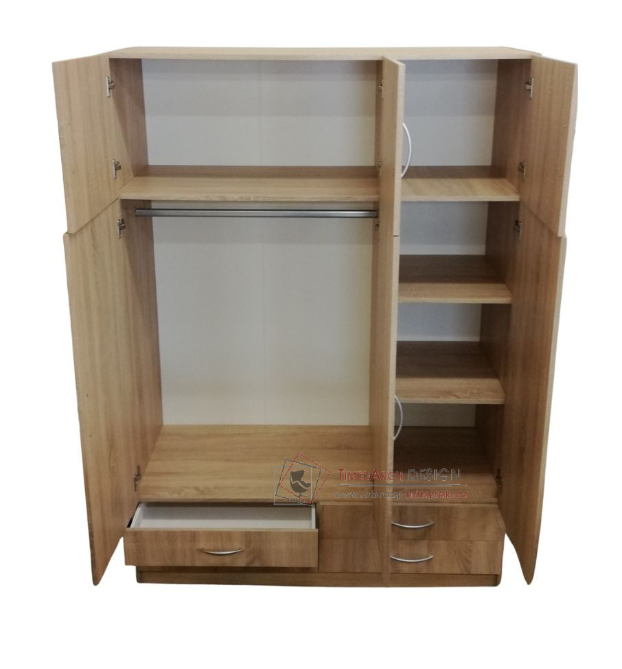 Vnitřní uspořádání skříně je praktické a poskytuje dostatek úložného prostoru. Své uplatnění najde v ložnici, předsíni i v dětském pokoji. Skříň je dodávaná v demont. Součástí balení je montážní plánek včetně všech potřebných spojovacích materiálů. Vlivem nastavení monitorů, nebo displejů telefonů, se zobrazení barev na fotograii může od skutečnosti lišit.