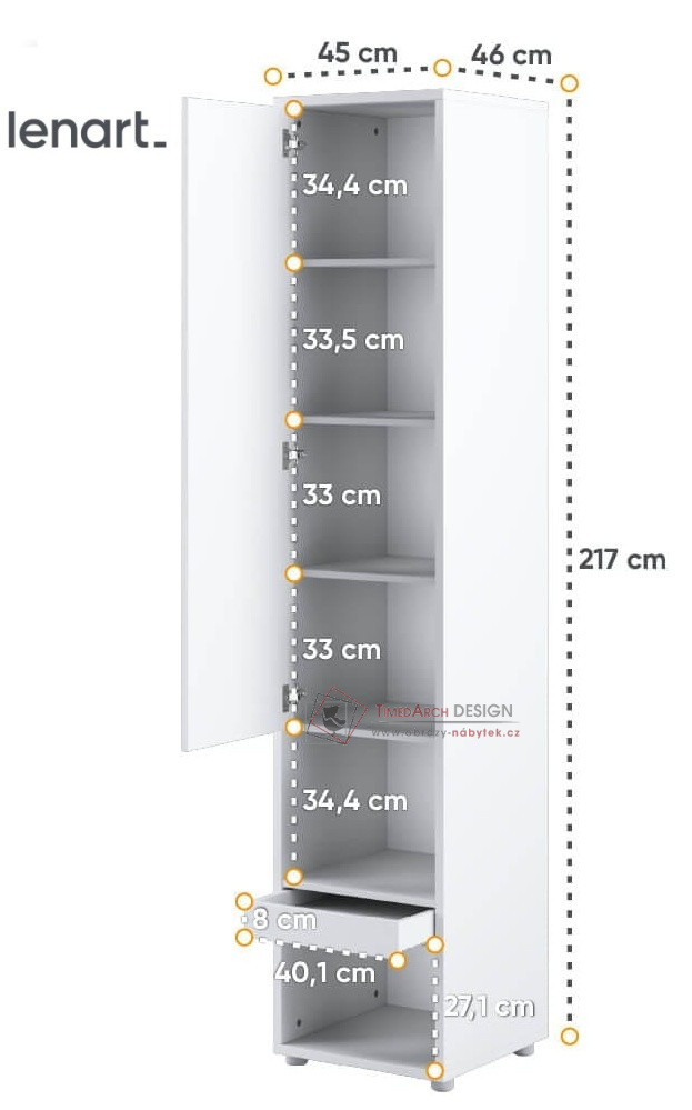 Skříň má 1 dvířka a pod nimi dvě poličky. Nábytek je vyrobený z laminované DTD, hrany jsou olepené ABS hranou v bílém provedení. Lamino je odolné proti poškrábání, poškození, vlhkosti a vysokým teplotám.