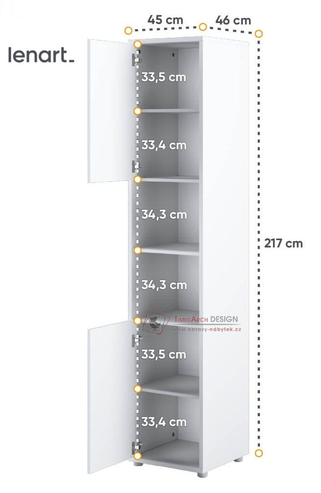 Skříň má 2 dvířka a v prostřední části dvě poličky. Nábytek je vyrobený z laminované DTD, hrany jsou olepené ABS hranou v bílém provedení. Lamino je odolné proti poškrábání, poškození, vlhkosti a vysokým teplotám.