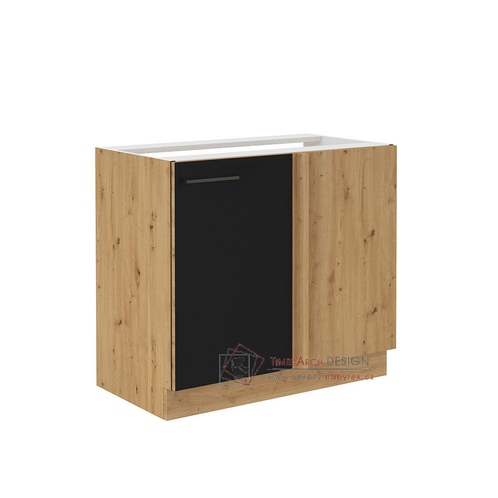 Spodní skříňka Monrovia 105 ND 1FBB disponuje jednou skříňkou s dvířky. Dvířka jsou v provedení černý mat, korpus je v provedení dub artisan. Vnitřek skříně je bílý. Dvířka se otevírají pomocí úchytky. Skříňka je určena do rohu rohové kuchyňské linky. Její čistá šířka je 90cm, instaluje se však o 15cm dál od stěny, protože se počítá s osazením pracovní desky. Skříňka je dodávána včetně dolní lišty, bez pracovní desky. Vyniká také tichým dorazem dvířek.