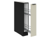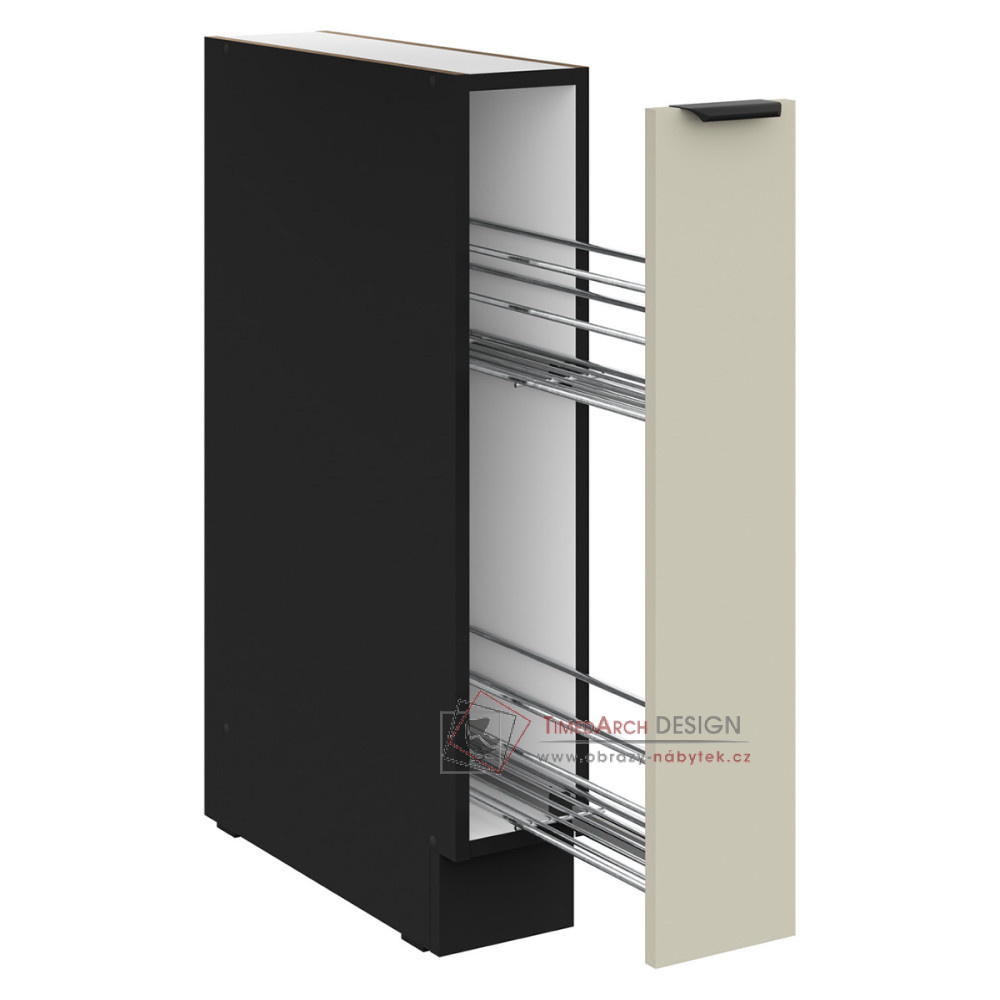 Dolní skříňka ARAKA 15 D CARGO BB je s dvířky. Uvnitř ukrývá výsuvný kovový koš. Skříňka je dodávána s dolní lištou bez pracovní desky. V kombinaci cashmere s černou barvou.