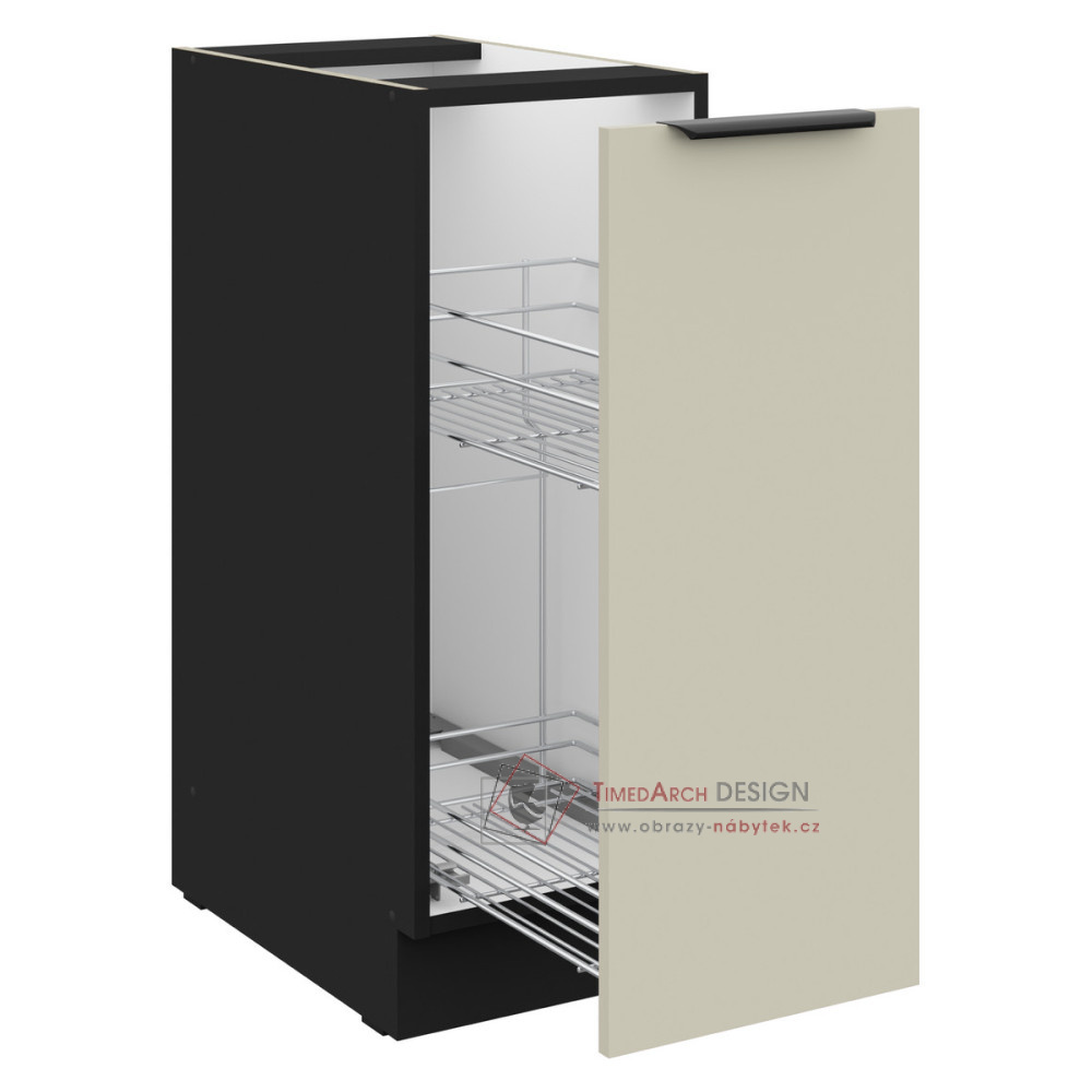 Dolní skříňka ARAKA 30 D CARGO BB je s dvířky. Uvnitř ukrývá výsuvný kovový koš. Skříňka je dodávána s dolní lištou bez pracovní desky. V kombinaci cashmere s černou barvou.