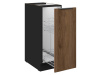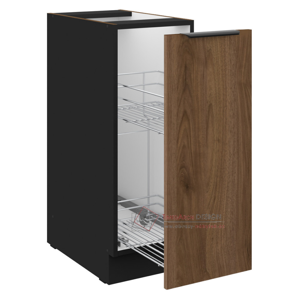 Dolní skříňka MENZO 30 D CARGO BB je s dvířky. Uvnitř ukrývá výsuvný kovový koš. Skříňka je dodávána s dolní lištou bez pracovní desky. V kombinaci ořech okapi s černou barvou.