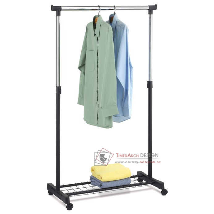 Pojízdný věšák s kolečky a jednou závěsnou výškově nastavitelnou tyčí v provedení nerezový kov + černý plast.