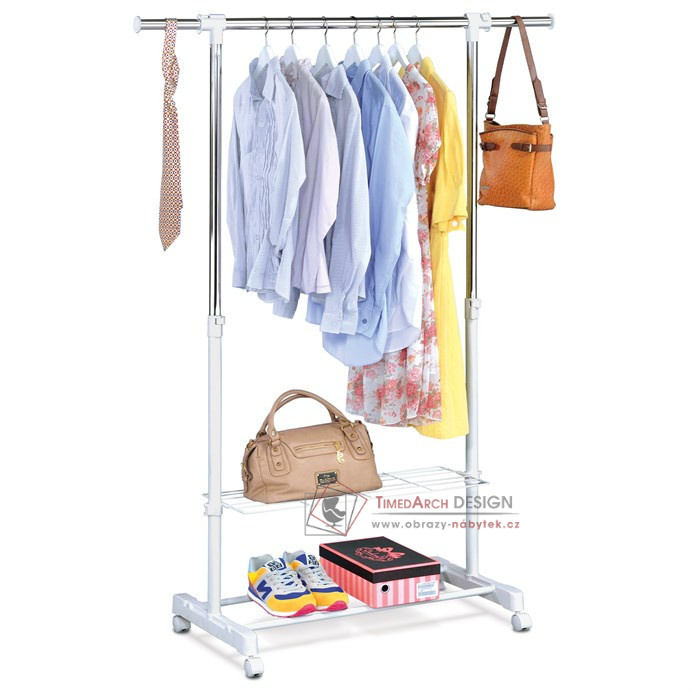 Stojan na šaty, jednoramenný, s pojezdem bez aretace v provedení chrom / bílá barva kovu a plastu a praktickým odkladačem tvořeným dvěmi kovovými spojovacími trubkami a drátěnou odkládací poličkou, kterou si můžete libovolně nastavit dle aktuální potřeby. Doporučená nosnost je 5 kg rovnoměrně rozložené zátěže na jedno rameno a 2 kg na poličku. Horní rameno je na obou koncích opatřeno teleskopickými rektifikovatelnými koncovkami a můžete ho vysunout až do úžasné celkové šíře 133 cm. Stojan je určený do domácností a není určen pro zátěžový provoz. Výškově nastavitelný. Dodáváno v demontovaném stavu.