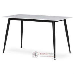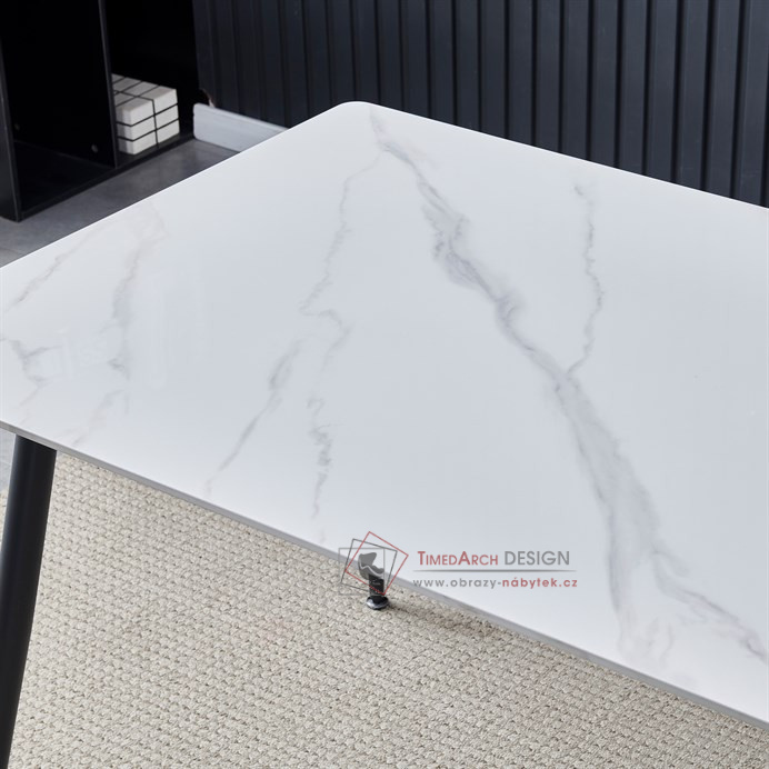 Bílá deska ze slinuté keramiky s matnou povrchovou úpravou připomíná moderní industriálního styl. Bílý jídelní stůl se projevuje v kontrastu s černou kovovou podnoží, což zvyšuje estetický dojem jídelního prostoru. Mistrovské dílo v podobě stolu je vyrobeno ze slinuté keramiky, která se podobá špičkovému mramoru a zajišťuje vynikající odolnost a nenáročnou údržbu. Obdélníkový tvar desky umožní pohodlné stolování několika osob najednou. Elegantní jídelní stůl HT-403M WT, který se vyznačuje obsahem elegance a modernosti, se hodí do kanceláře i domácnosti. Kombinace bílé a černé barvy nabízí elegantní a zároveň odvážné vyjádření a vykreslí sofistikovaný obraz prostoru, v němž se nachází.