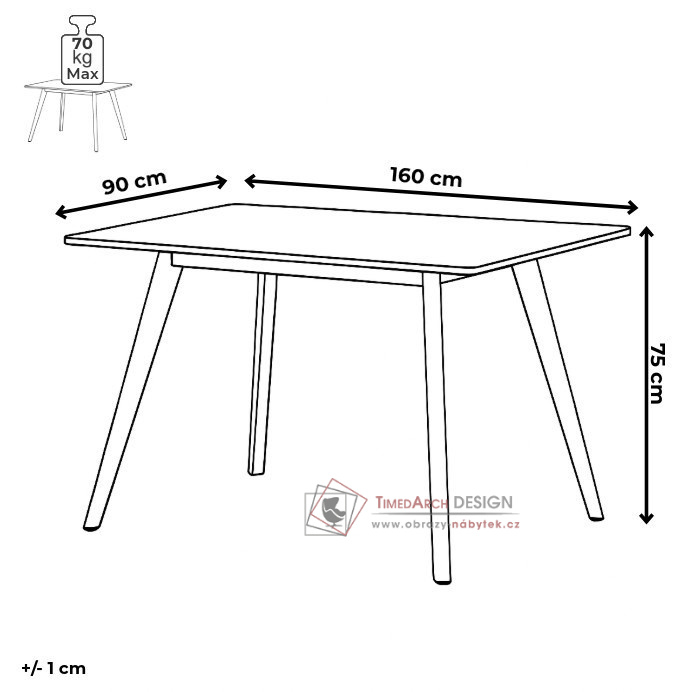 Obdélníková deska z kvalitního MDF materiálu imituje vzhled opracovaného dřeva a přidává prostoru na autentičnosti a teple. Černé kovové nohy přidávají industriální kontrast a zajišťují pevnost a stabilitu. Svým nadčasovým designem a praktickými rozměry 160x90x75 cm se tento stůl hodí do různých stylů jídelen i kuchyní. Vyberte si tento elegantní a odolný stůl od Autronic a dopřejte si pohodlné rodinné stolování.