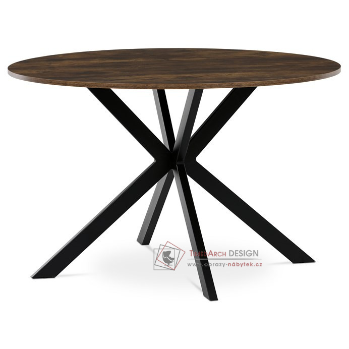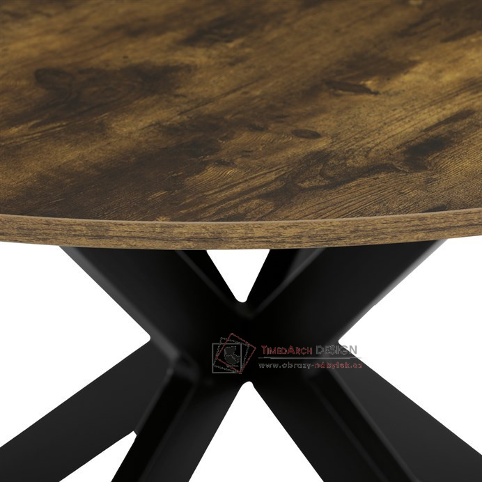 Jídelní kulatý stůl HT-F4120 OLW vyniká kombinací přírodního dekoru starého dřeva na MDF desce a robustní konstrukce s černými kovovými nohami.