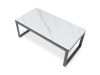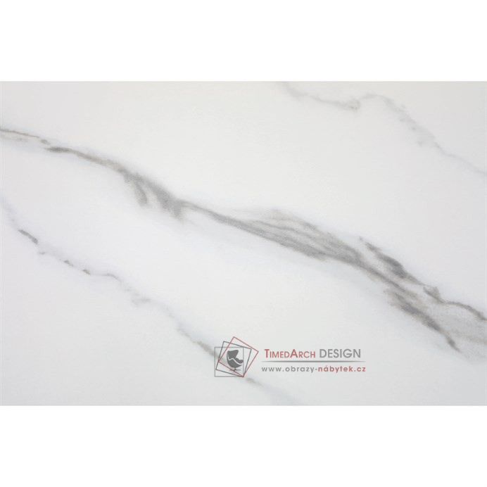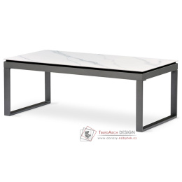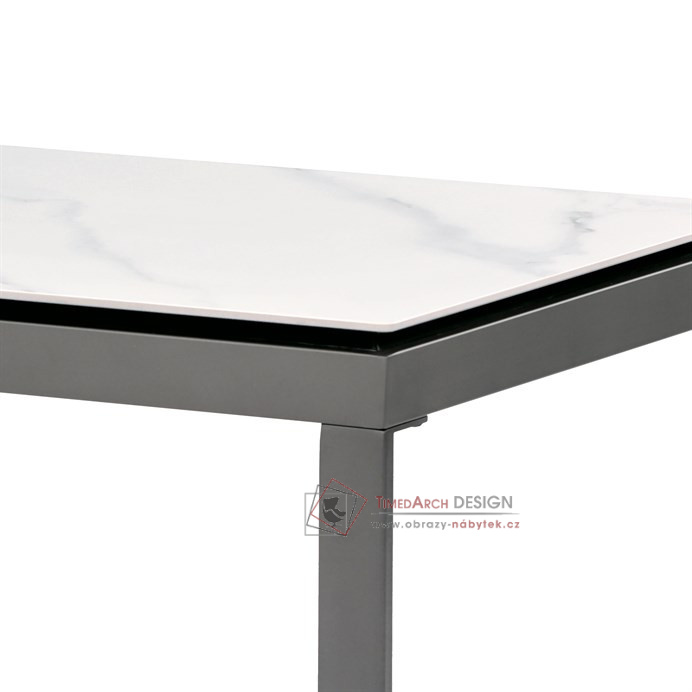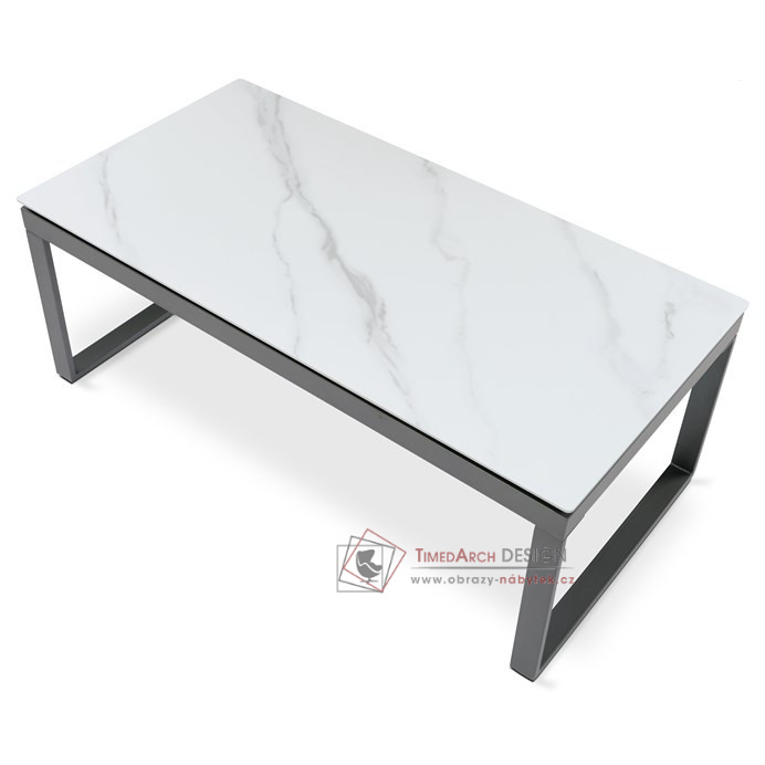 Odkládací deska je vyrobena ze slinutého kamene v dekoru bílý matný mramor "Snow Mountain" a celá je nadsazena nad minimalistého kovový rám ve velmi žádaném šedém trendy odstínu "Gunmetal grey". Tento rám doplňuje podnož ve tvaru "U" ve stejném barevném odstínu. Odsazená deska působí luxusně a vytváří dojem levitace a odlehčení. Ostatní vybrané materiály společně tvoří estetický harmonický celek, ale zároveň i praktičnost, jako je stabilita a trvanlivost. Šíře konferenčního stolku je 121 cm, hloubka 60 cm a výška 45 cm. Nosnost do 25 kg.