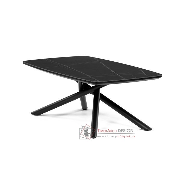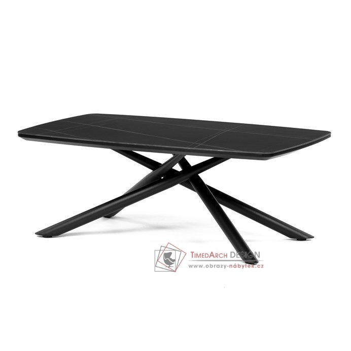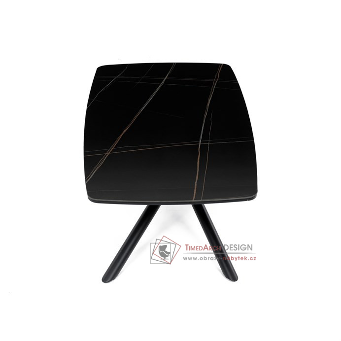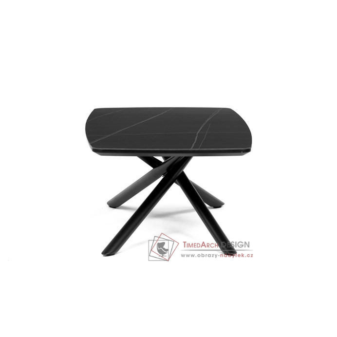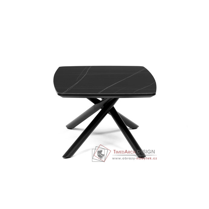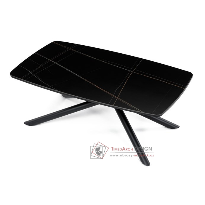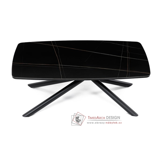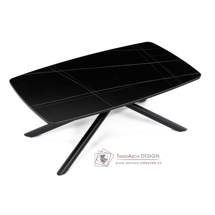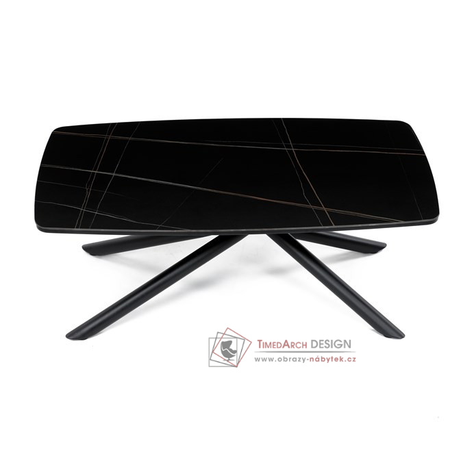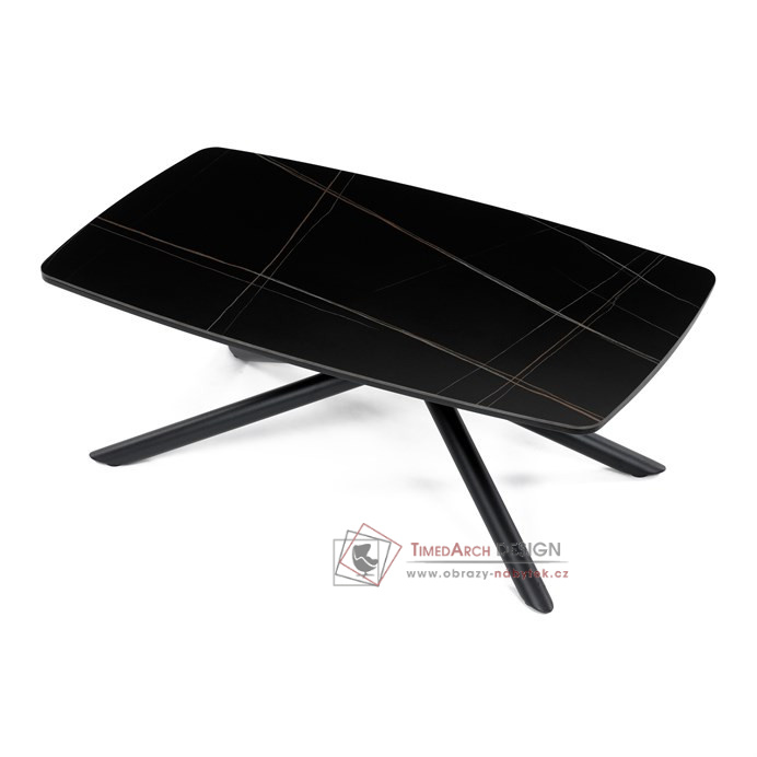 Deska ze slinuté keramiky s imitací černého mramoru dodává stolu luxusní vzhled. Pevná kovová konstrukce v černé barvě poskytuje stabilitu a elegantně kontrastuje s tmavou deskou. Centrální kruhová podnož tvoří originální prvek, který oživí jakýkoliv moderní interiér. Tento stolek je ideální pro obývací pokoje, kde chcete kombinovat styl s funkčností. Výjimečný design z něj dělá dominantní prvek vašeho prostoru.