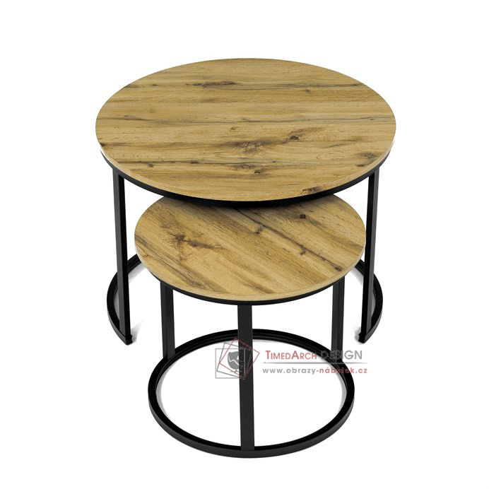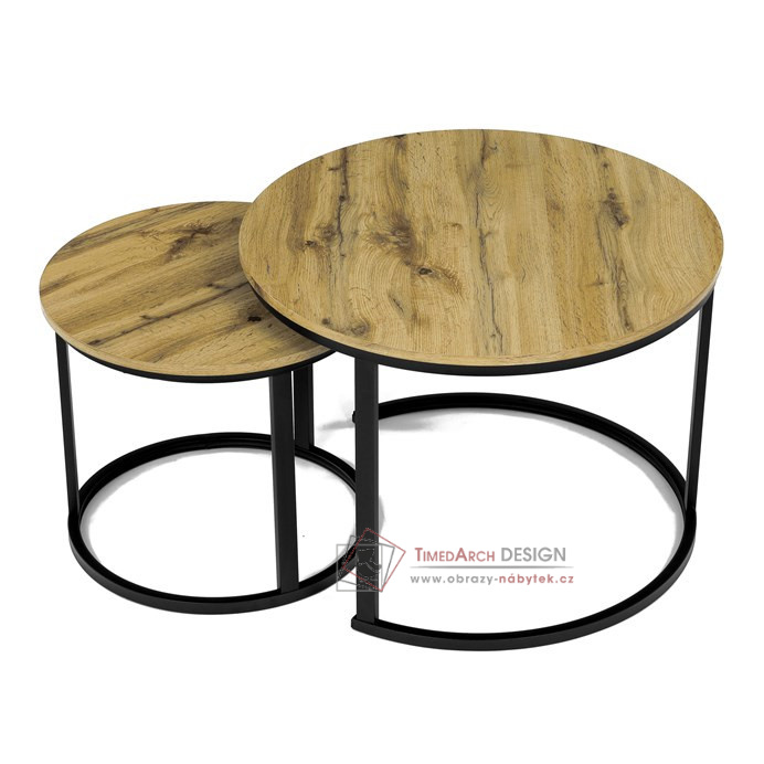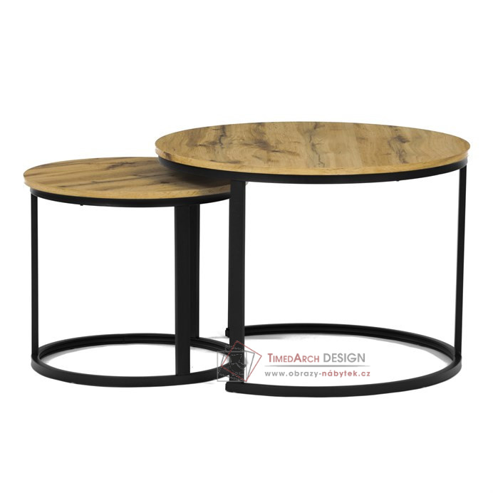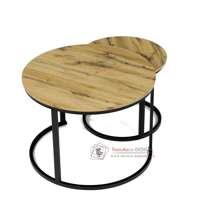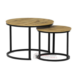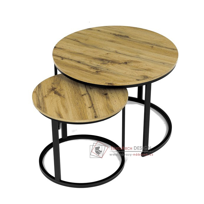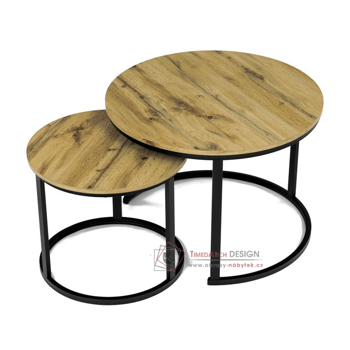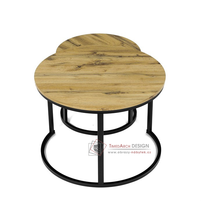 Desky z MDF s dekorem divokého dubu v kombinaci s černými kovovými nohami vytvářejí stylový kontrast. Kruhový design a možnost menší stolek snadno umístit pod větší nabízí flexibilitu pro úsporu místa. Matný povrch desky je snadno udržovatelný a odolný vůči poškození. Tento set je ideální jak pro menší prostory, tak pro interiéry, kde vynikne svým moderním vzhledem a funkčním designem.