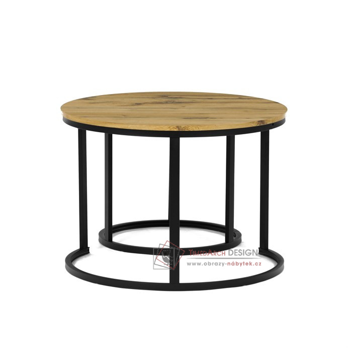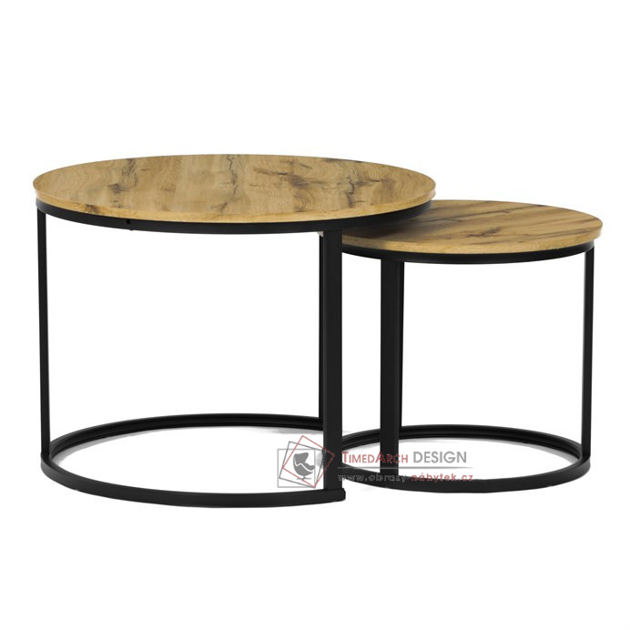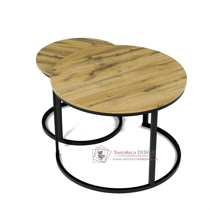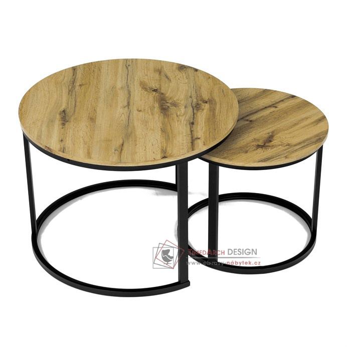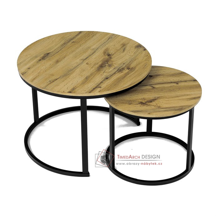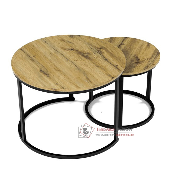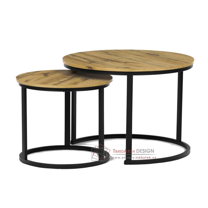 Desky z MDF s dekorem divokého dubu v kombinaci s černými kovovými nohami vytvářejí stylový kontrast. Kruhový design a možnost menší stolek snadno umístit pod větší nabízí flexibilitu pro úsporu místa. Matný povrch desky je snadno udržovatelný a odolný vůči poškození. Tento set je ideální jak pro menší prostory, tak pro interiéry, kde vynikne svým moderním vzhledem a funkčním designem.