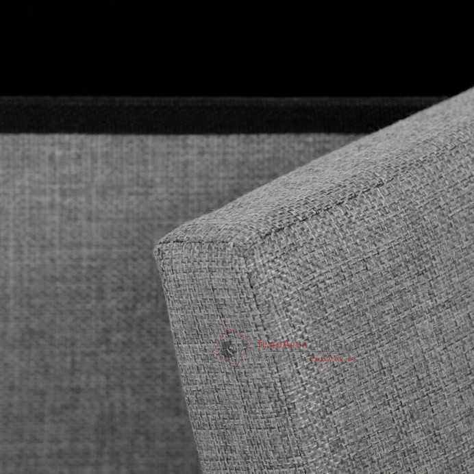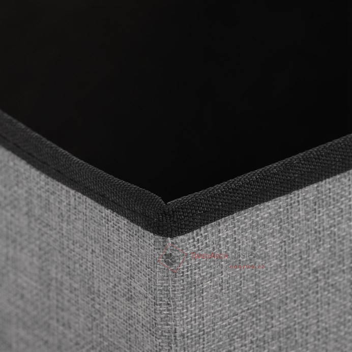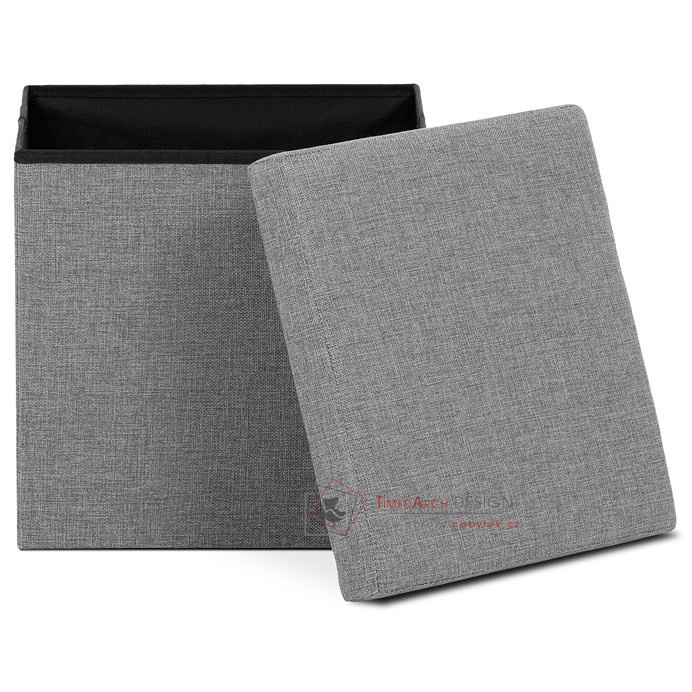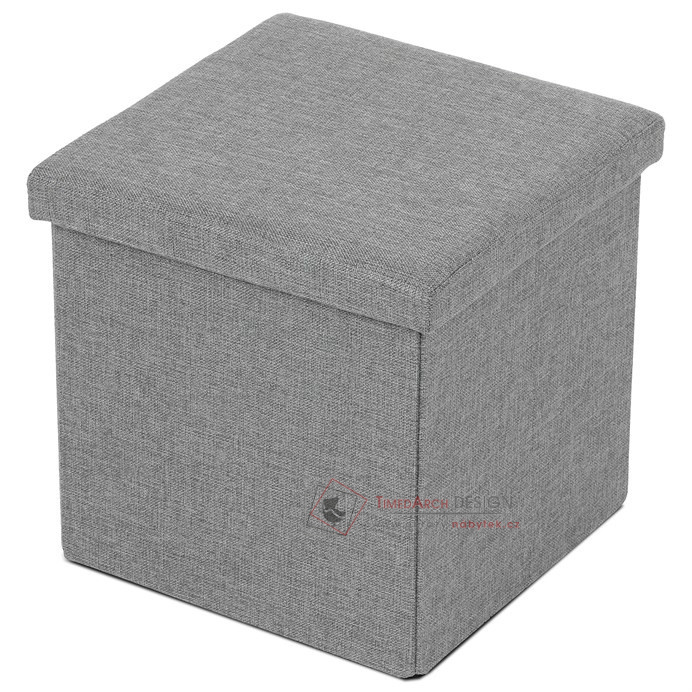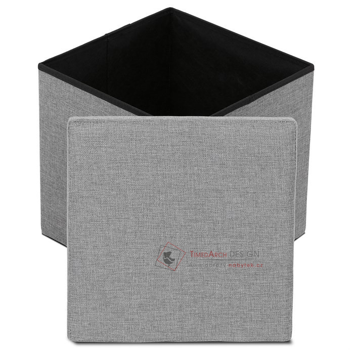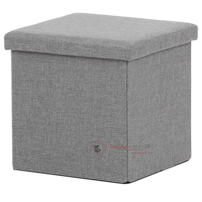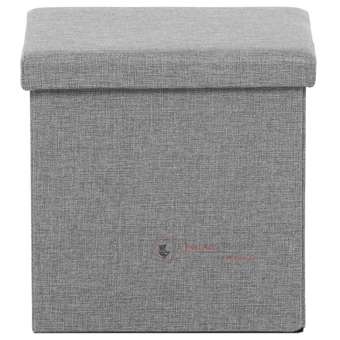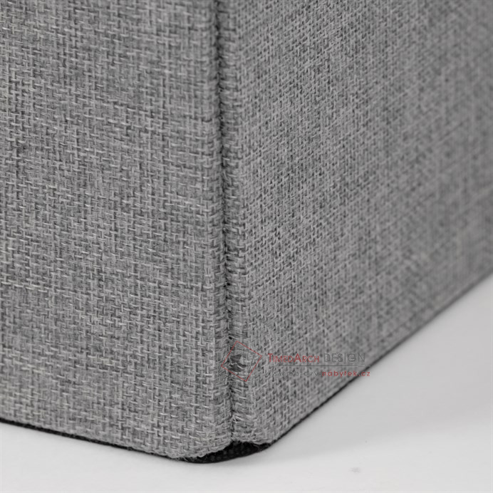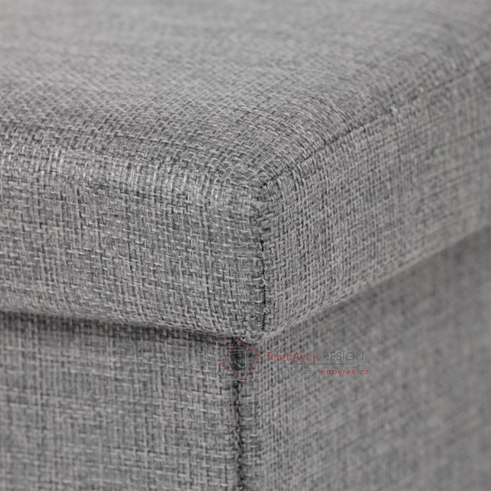 Celočalouněný skládací taburet s úložným prostorem je očalouněný látkou šedé barvy.