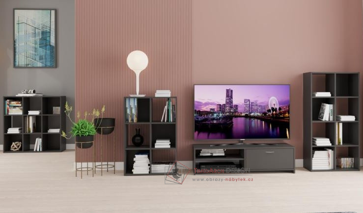 Televizní stolek s výklopnými dvířky je vyrobený z kvalitní laminované DTD v barevném provedení černá.