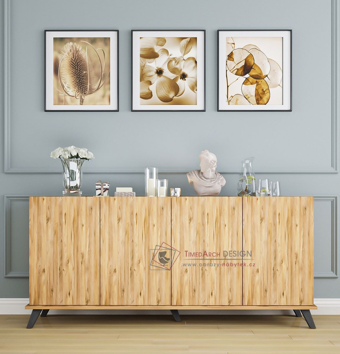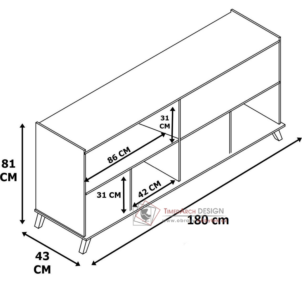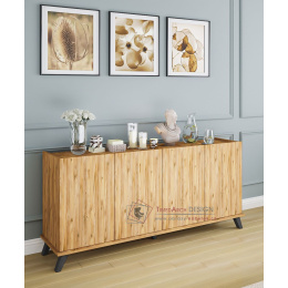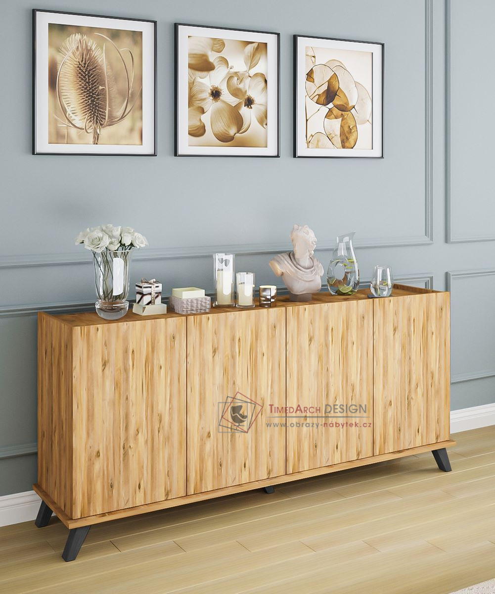 Široká 4-dveřová komoda vhodná i jako jídelní skříňka, TV stolek nebo víceúčelový nábytek, s rozměry 180 × 43 × 81 cm.