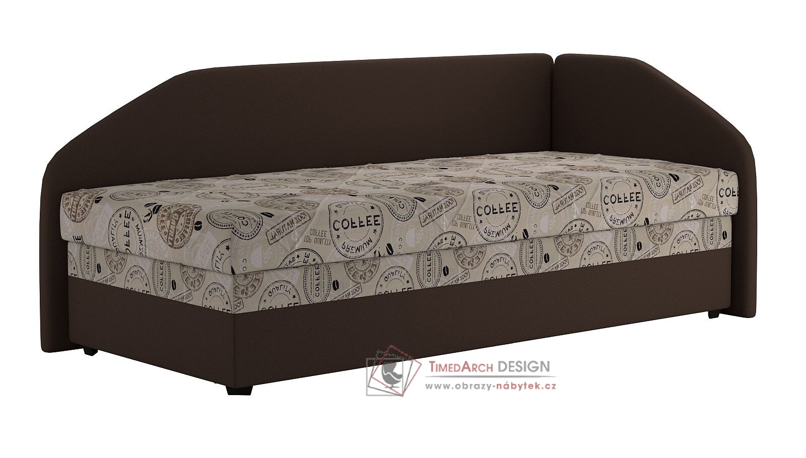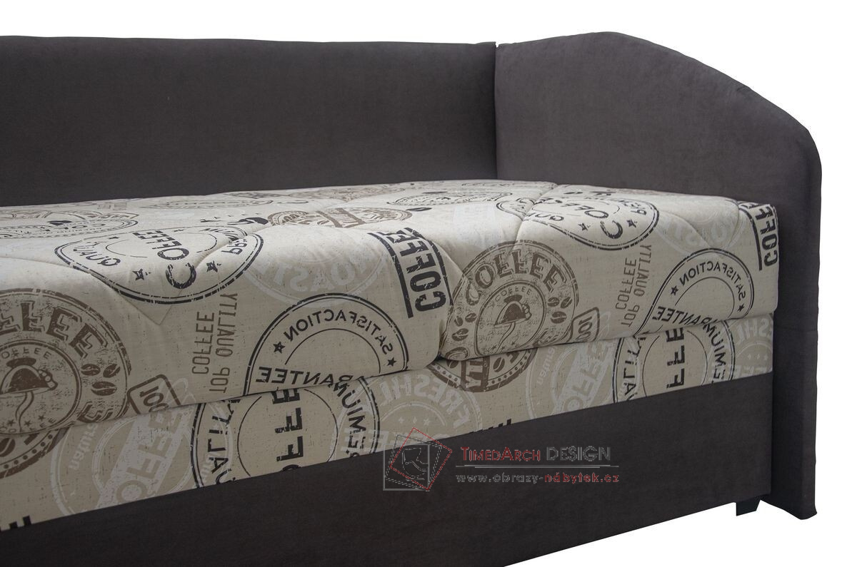 Válenda je očalouněna v kombinaci látky barvy hnědé TRINITY 8 (korpus) a látky světle hnědé se vzorem COFFEE (matrace ) - viz foto.
