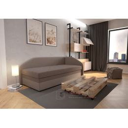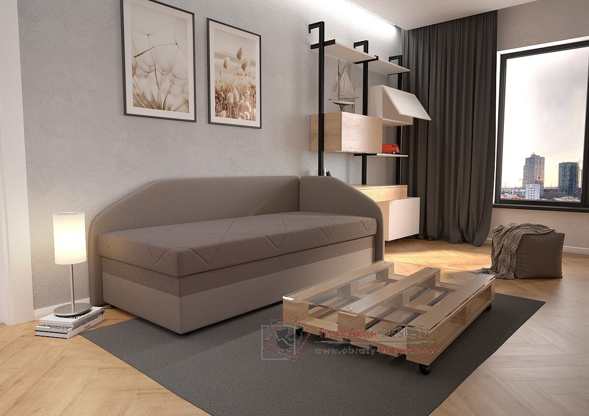 Válenda je očalouněna v kombinaci látek barvy světle hnědé LARGO 13 (korpus) a látky barvy tmavě hnědé ARTE 5 STONE (matrace ) - viz foto.