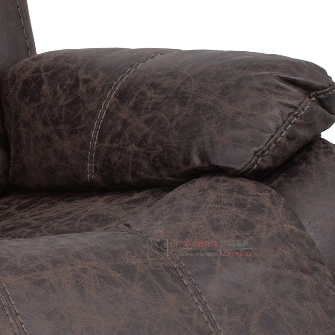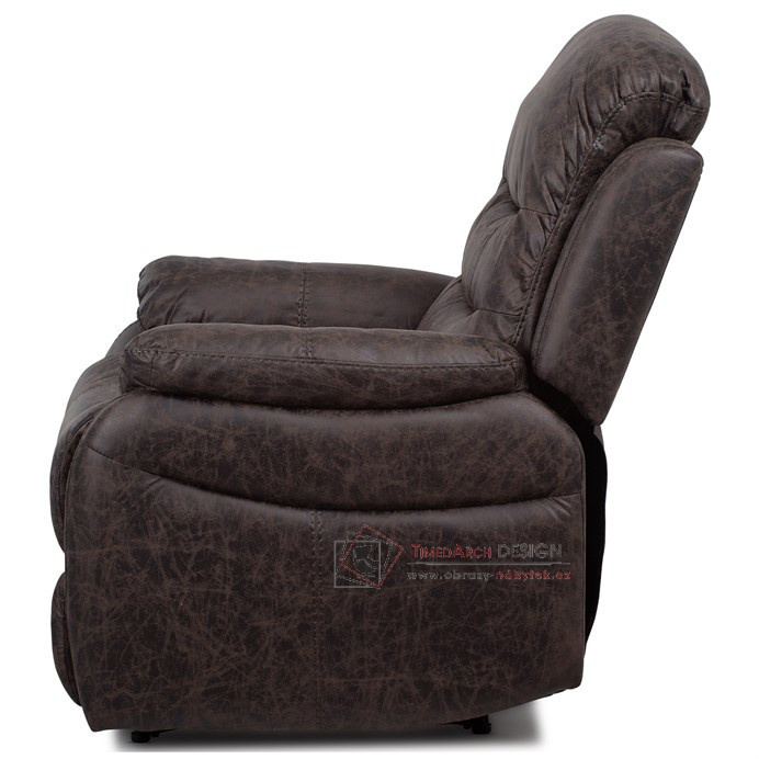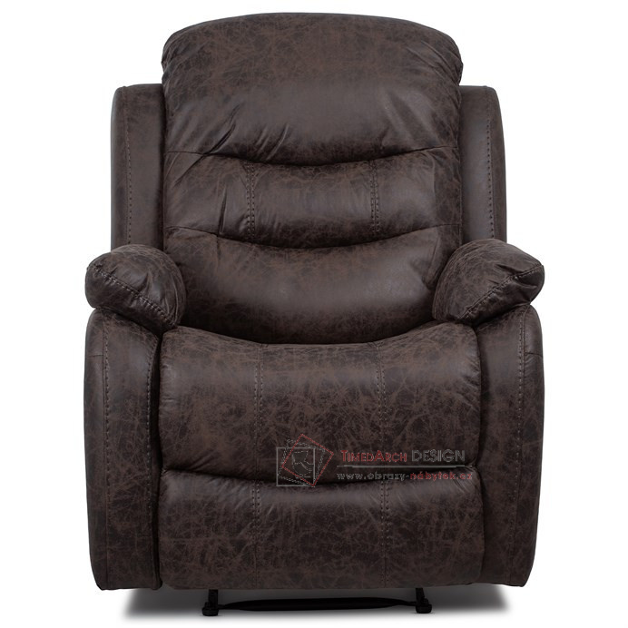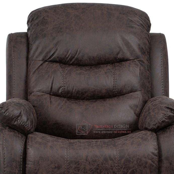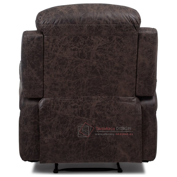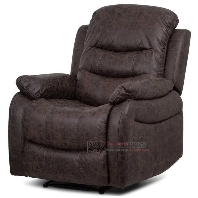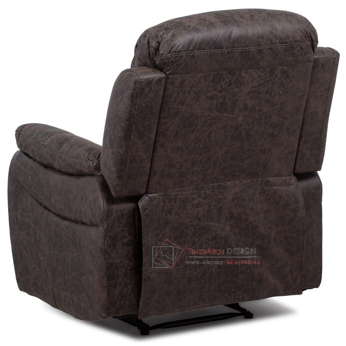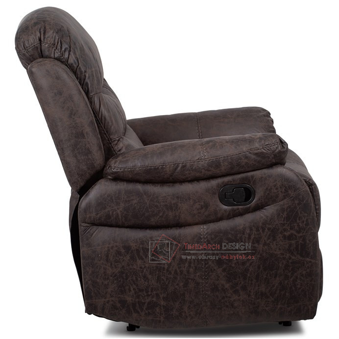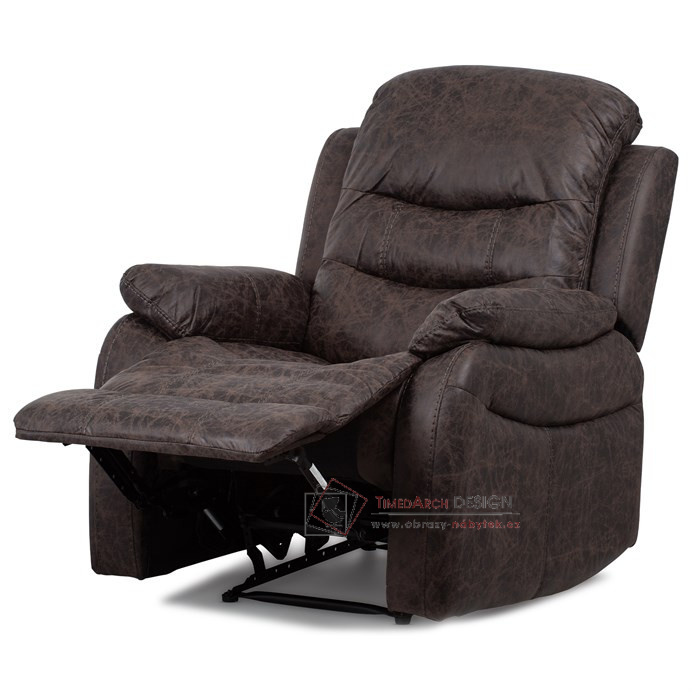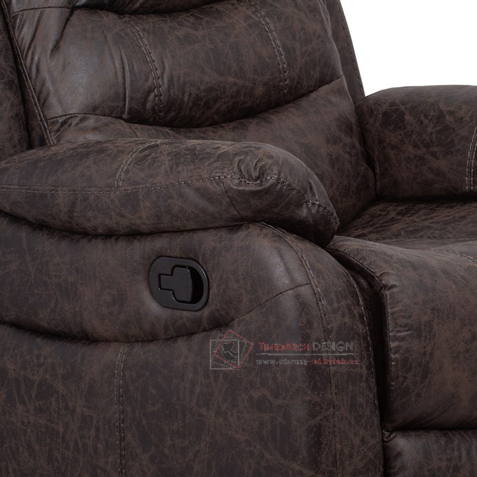 Potah je z hnědé látky v dekoru vintage kůže. Kostra je z masivního dřeva. Mechanická konstrukce je kovová s kvalitním práškovým nástřikem v černé barvě. Výplň z PU pěny 28 kg/m2 na sedacích plochách, 22 kg/m2 na ostatních plochách. V místech sedáku jsou vlnovcové pružiny a elastické popruhy pro zpevnění. Funkce – polohovatelné ve dvou pozicích s aretací. Nosnost křesla je 130 kg. Je přímo ztělesněním pohody a relaxace. Hodí se do jakkoliv stylově zařízeného interiéru a v každém bude působit jako skvělý a hlavně pohodlný solitér.
